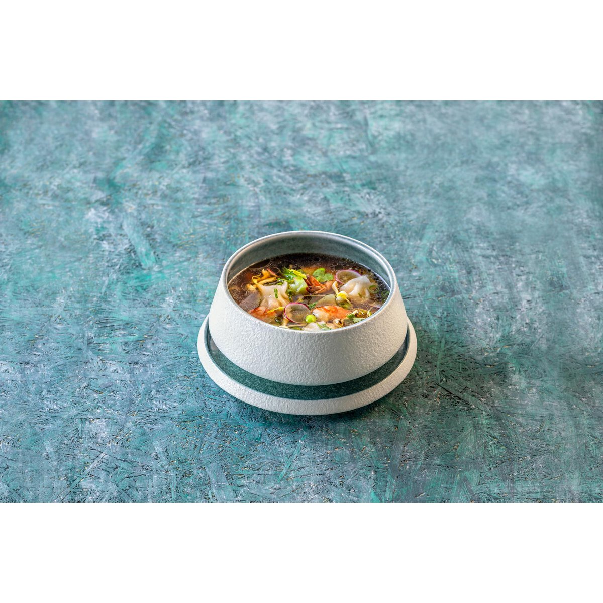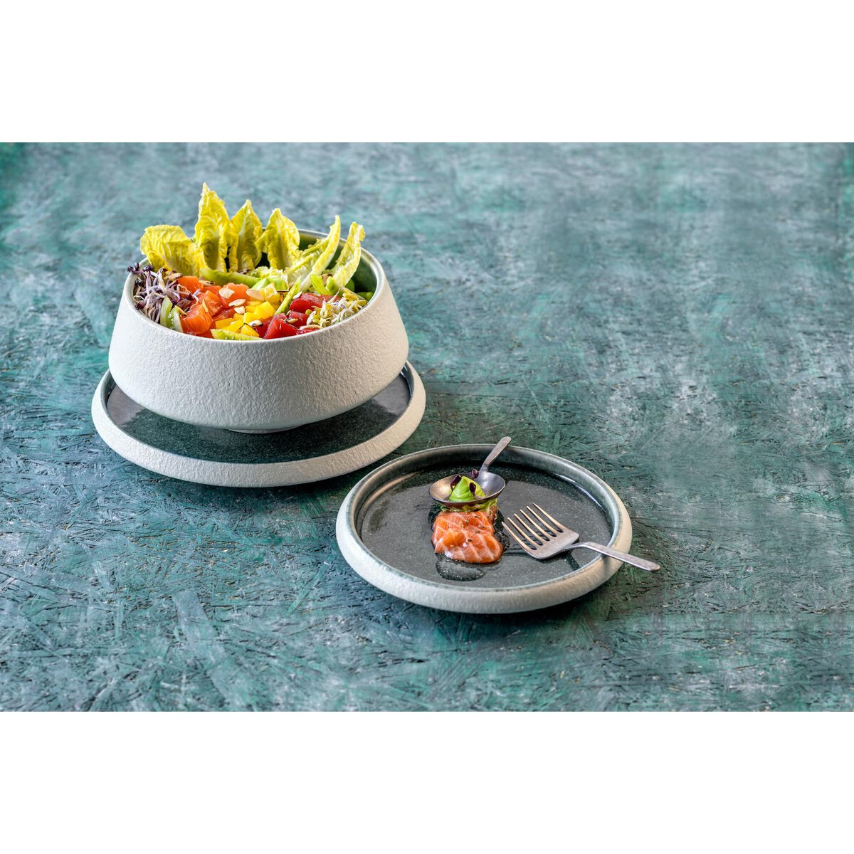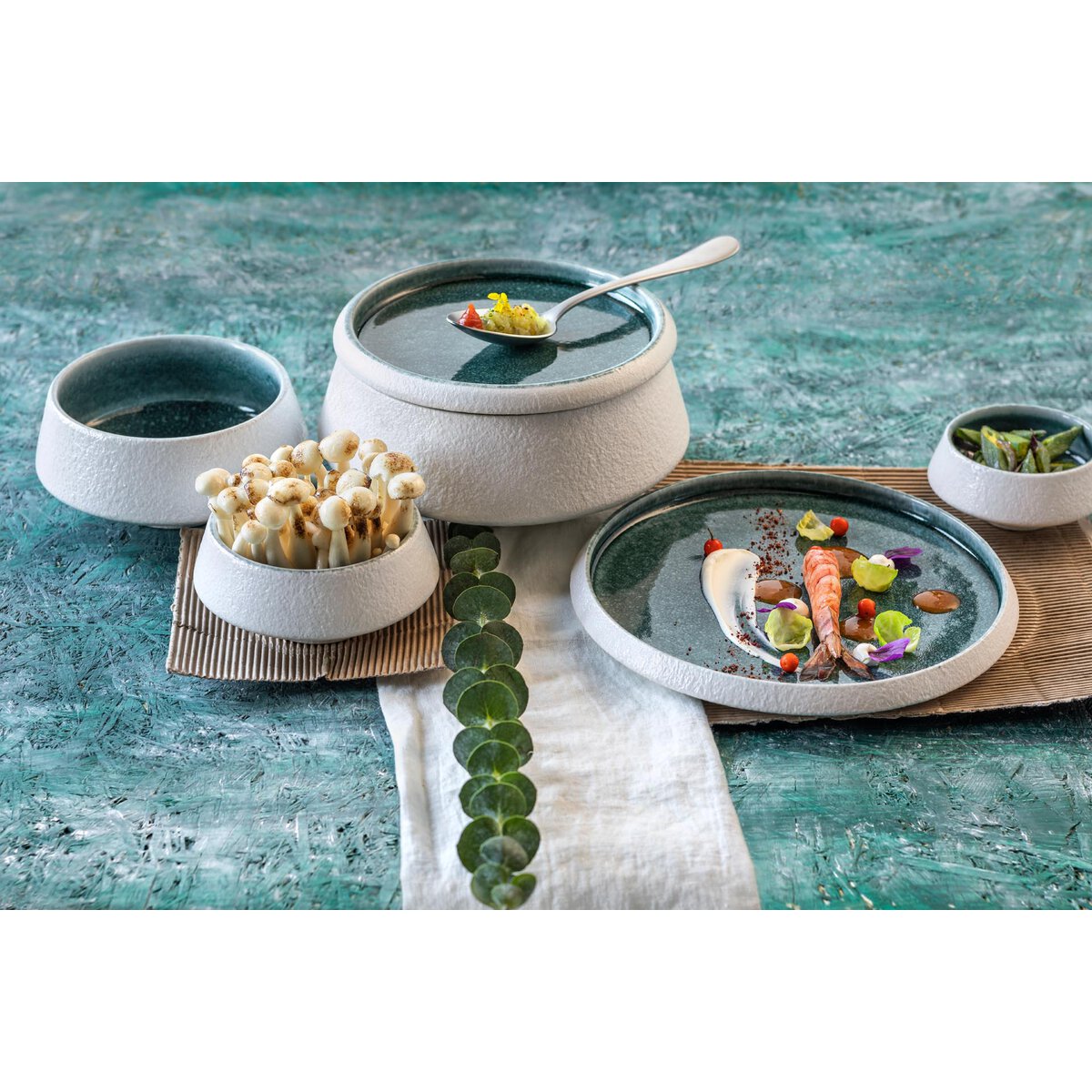 Porzellan. Tellerspiegel und Schüsselinnenseite mit glatter, glänzender Glasur in natürlichen Blautönen. Von außen besticht die Serie mit der ungleichmäßig strukturierten, mattweißen Glasur. Die kantige Form der Bowls, der erhöhte Rand der Teller und der unregelmäßige Farbverlauf sind weitere Besonderheiten und unterstreichen die Einzigartigkeit jedes Stücks dieser modernen Serie. Die Bowls lassen sich stapeln und mit den Tellern gut als Deckel oder Unterteller kombinieren. Mischsortierung.