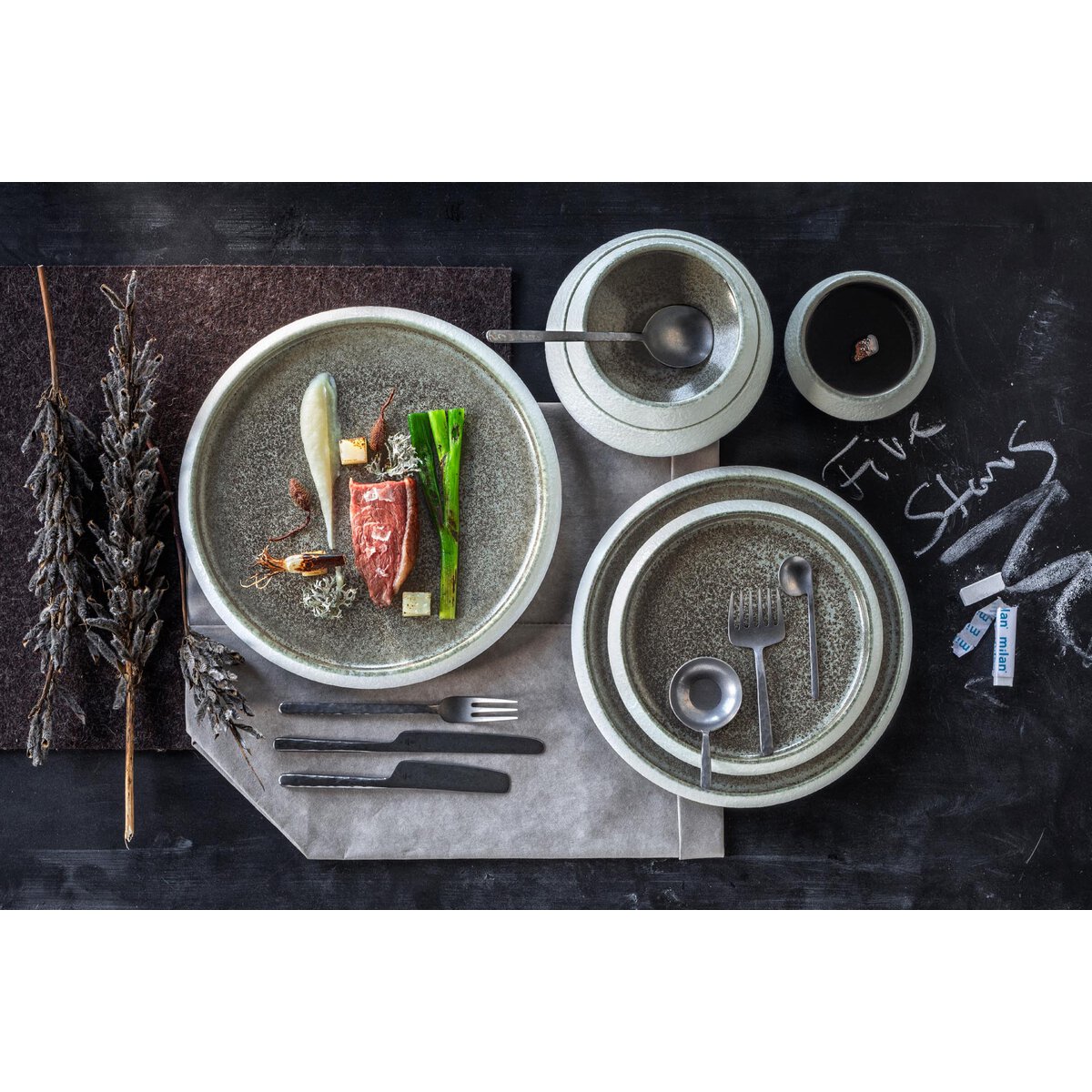 Porzellan. Tellerspiegel und Schüsselinnenseite mit glatter, glänzender Glasur in Grautönen gesprenkelt. Von außen besticht die Serie mit der ungleichmäßig strukturierten, mattweißen Glasur. Die kantige Form der Bowls, der erhöhte Rand der Teller und der unregelmäßige Farbverlauf sind weitere Besonderheiten und unterstreichen die Einzigartigkeit jedes Stücks dieser modernen Serie. Die Bowls lassen sich stapeln und mit den Tellern gut als Deckel oder Unterteller kombinieren. Mischsortierung.