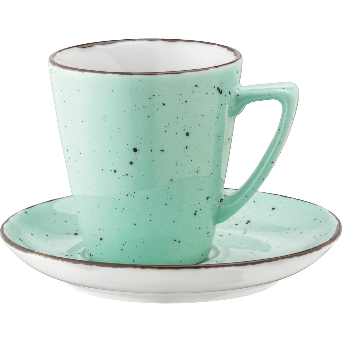 Porzellan. Grundfarbe mint (Farbverlauf bewusst unregelmäßig), Rand braun und Spiegel braun gesprenkelt. Mischsortierung.