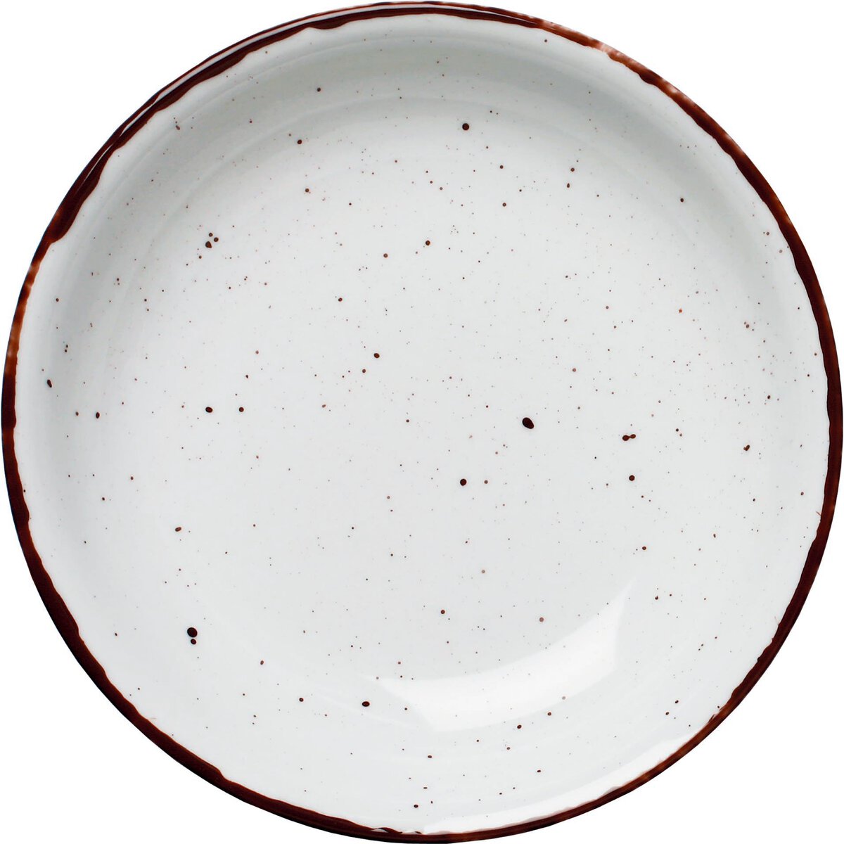 Porzellan. Grundfarbe weiß, Rand braun und Spiegel braun gesprenkelt. Mischsortierung.