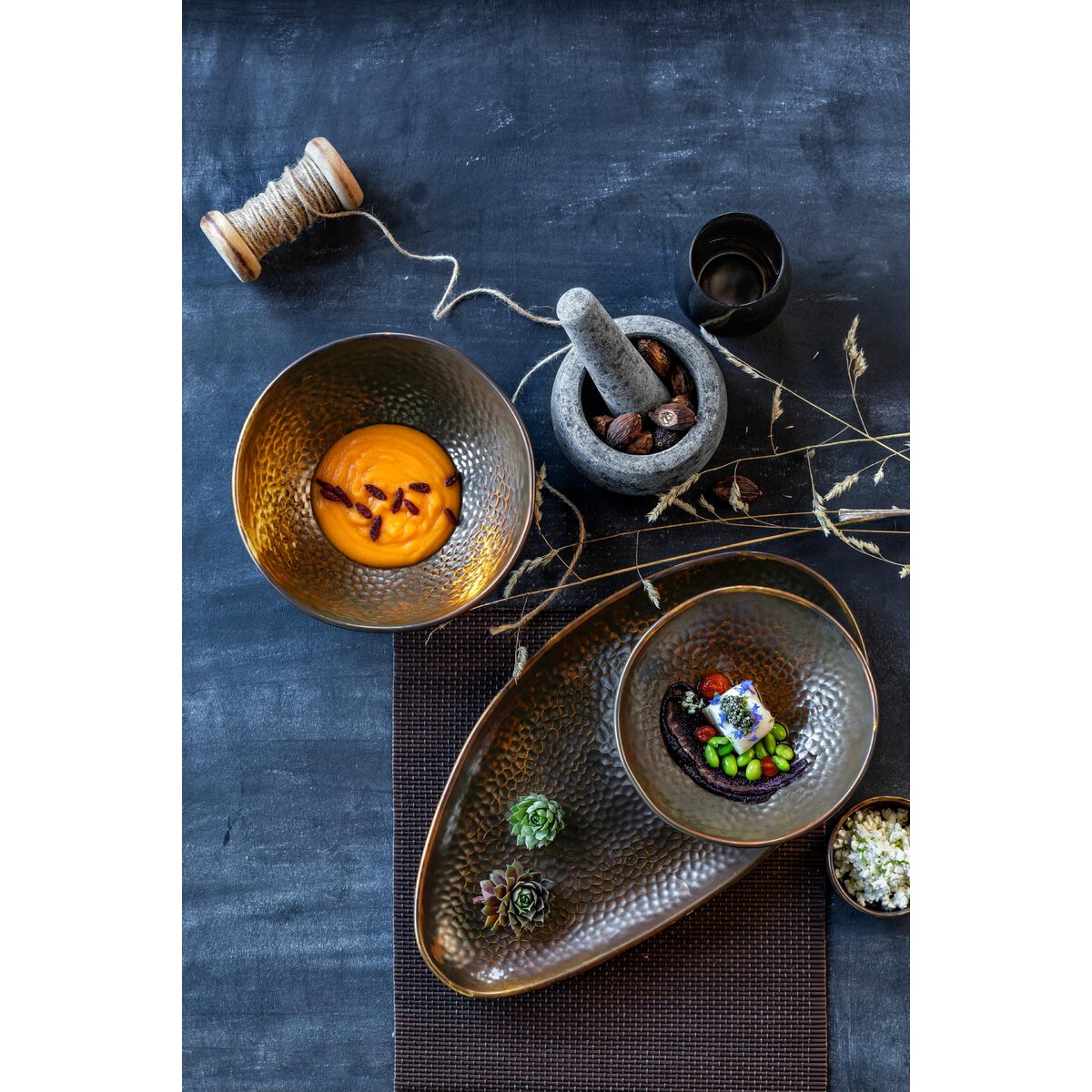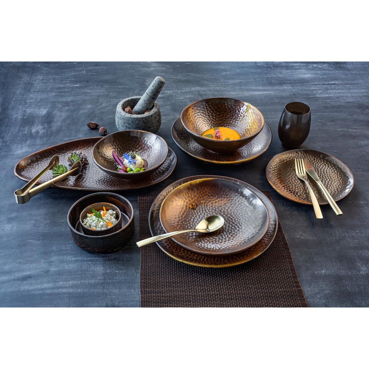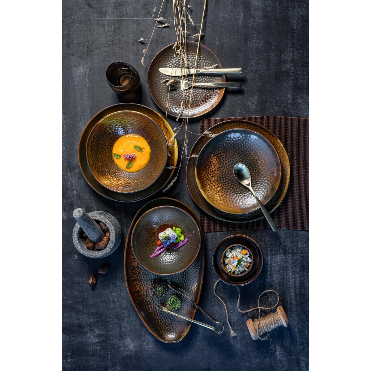Porzellan. Farbe braun. Diese trendige Serie besticht durch Ihre gehämmerte Struktur und den Farbverlauf in verschiedenen Brauntönen. Die überwiegend matte Glasur wird zusätzlich durch glänzende Akzente in Szene gesetzt. Die unregelmäßigen, organischen Formen unterstützen die Einzigartigkeit dieser Serie und machen jedes Stück zum Unikat. Mischsortierung.