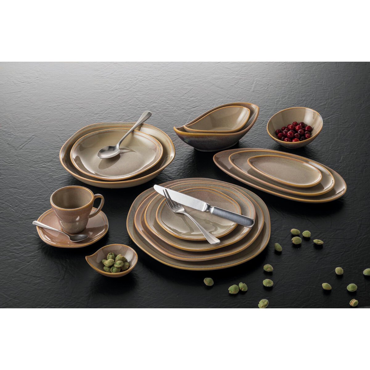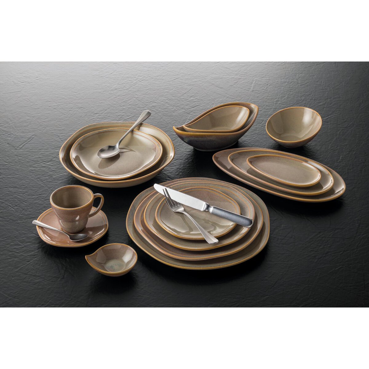 Porzellan in Keramikoptik. Mischsortierung. Glasur in farblich ineinander übergehenden Beige- und Erdtönen und einem unregelmäßigem beigen Rand - macht jedes Stück zum Unikat.