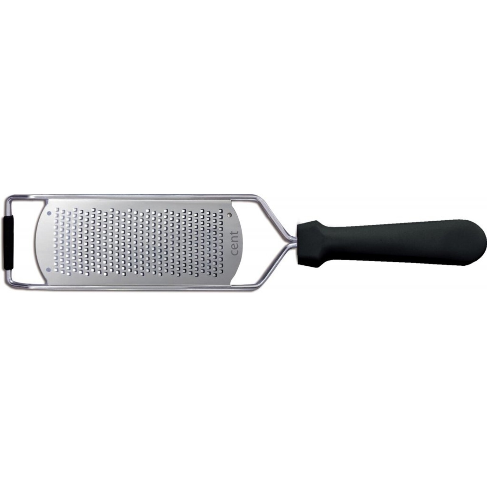 Reibe Edelstahl, schwarzer Kunststoffgriff, oval geformt, 31,5x6,5 cm, Spülmaschinengeeignet, Reinigung per Hand empfohlen.