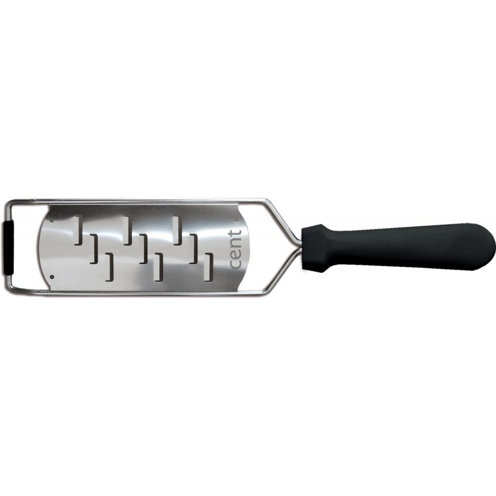Reibe Edelstahl, schwarzer Kunststoffgriff, oval geformt, 31,5x6,5 cm, Spülmaschinengeeignet, Reinigung per Hand empfohlen.