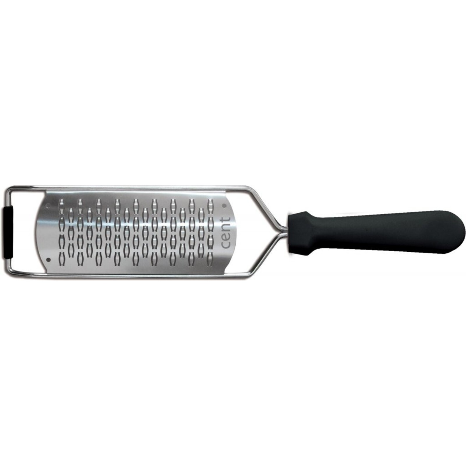 Reibe Edelstahl, schwarzer Kunststoffgriff, oval geformt, 31,5x6,5 cm, Spülmaschinengeeignet, Reinigung per Hand empfohlen.