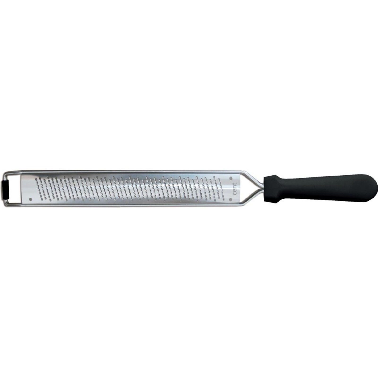 Reibe Edelstahl, schwarzer Kunststoffgriff, oval geformt, 39,5x3,5 cm, Spülmaschinengeeignet, Reinigung per Hand empfohlen.