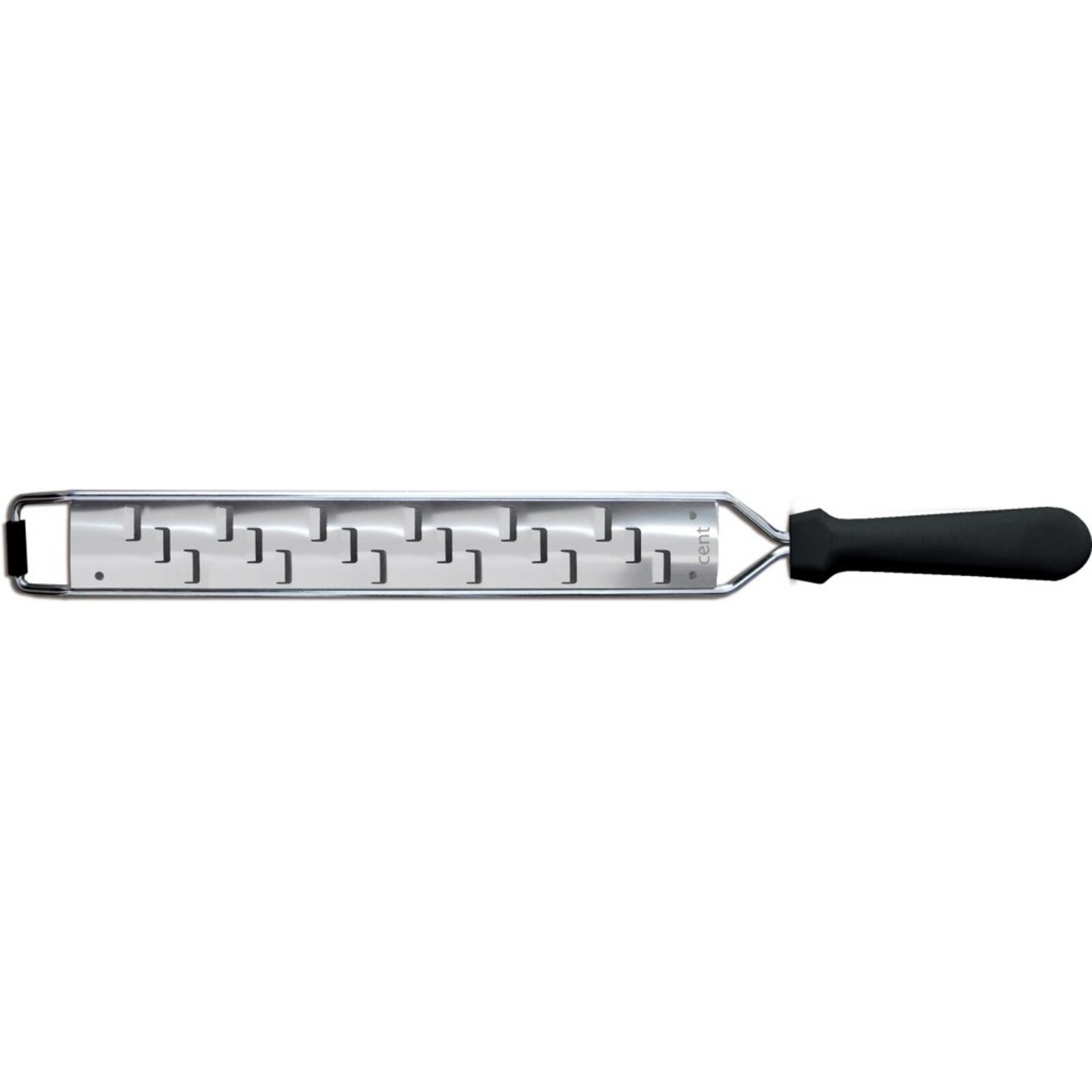 Reibe Edelstahl, schwarzer Kunststoffgriff, oval geformt, 39,5x3,5 cm, Spülmaschinengeeignet, Reinigung per Hand empfohlen.