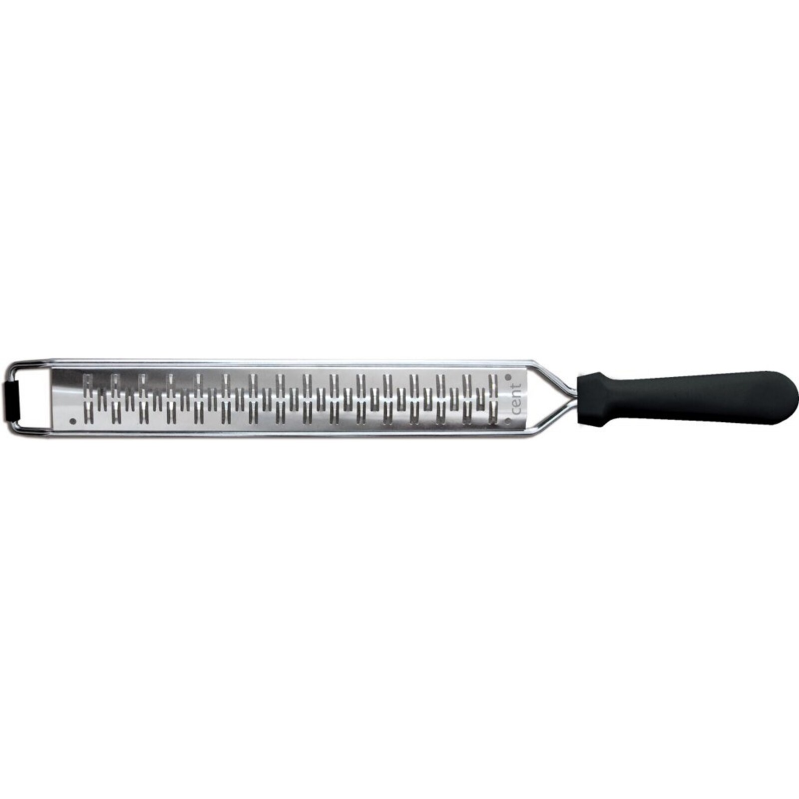 Reibe Edelstahl, schwarzer Kunststoffgriff, oval geformt, 39,5x3,5 cm, Spülmaschinengeeignet, Reinigung per Hand empfohlen.