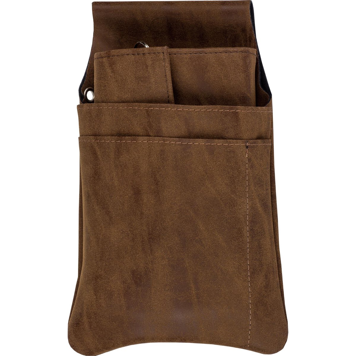 Kunstleder (Nubuk)/Feinsynthetik, dunkelbraun. 1 Fach für die Kellnerbörse und 1 Zusatzfach für Notizblock und Kugelschreiber.