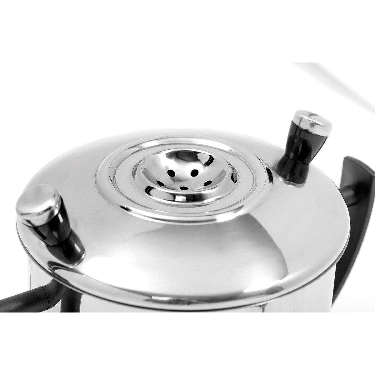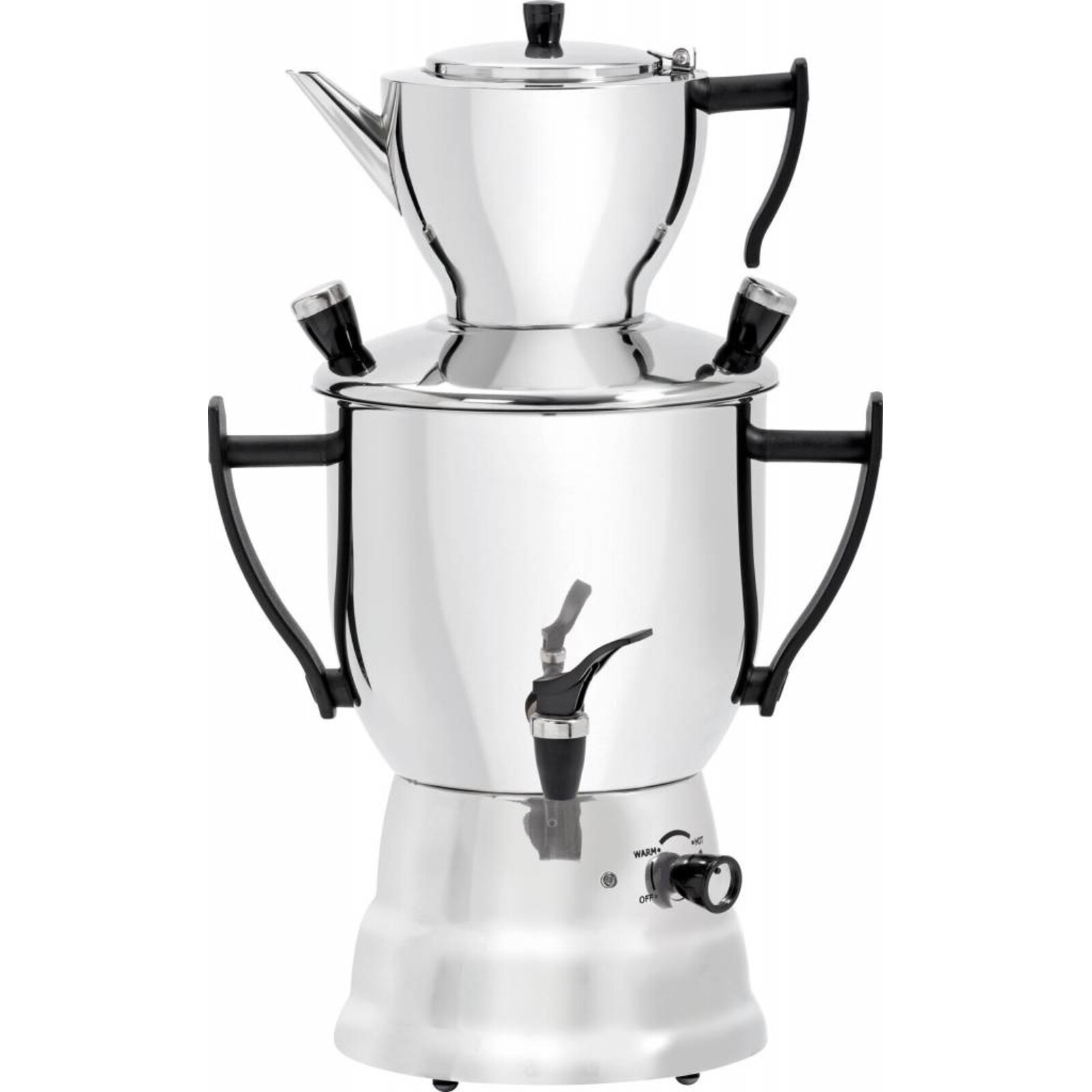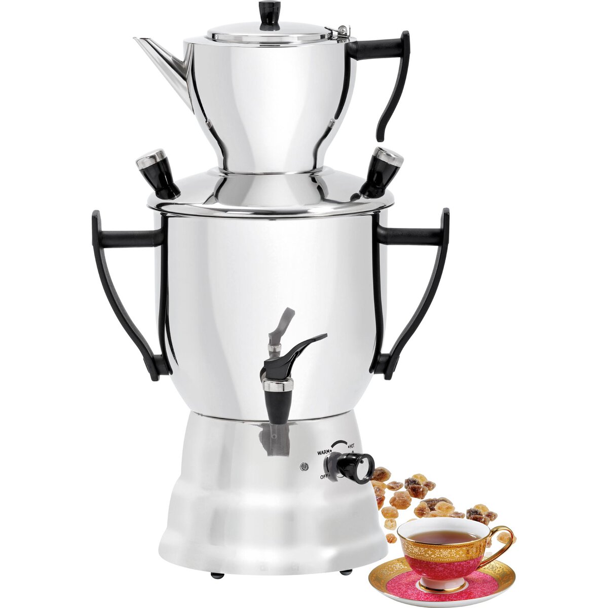 Edelstahl 18/10, hitzeisolierte Griffe, Überhitzungsschutz, stufenlose Temperaturregelung. Inkl. Teekanne mit 1,2 L Inhalt und Teesieb.