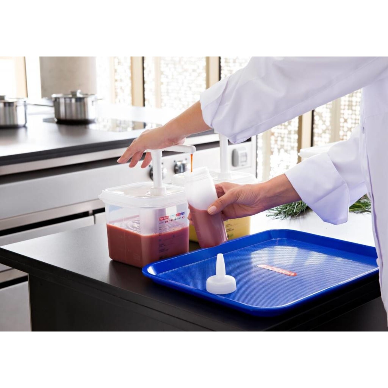 Polypropylen, transparent. Für Dressings, Soßen, Sirups, etc. Inkl. integrierter Skala, aufgedrucktes Etikett zum Beschriften mit Art.-Nr. 146700 (Stift schwarz), 4 farbliche Markierungsplättchen. Pumphahn ist platzsparend zu versenken.