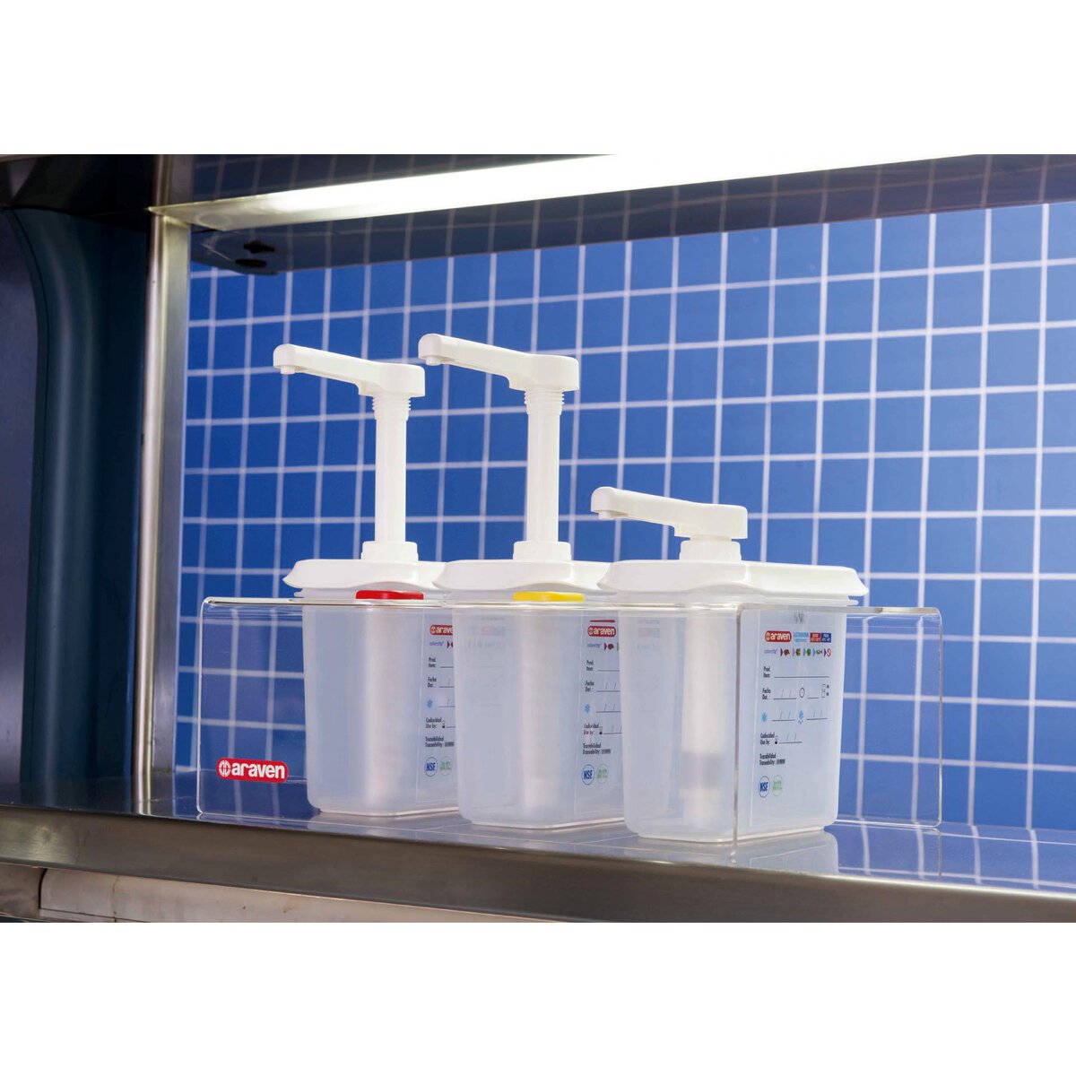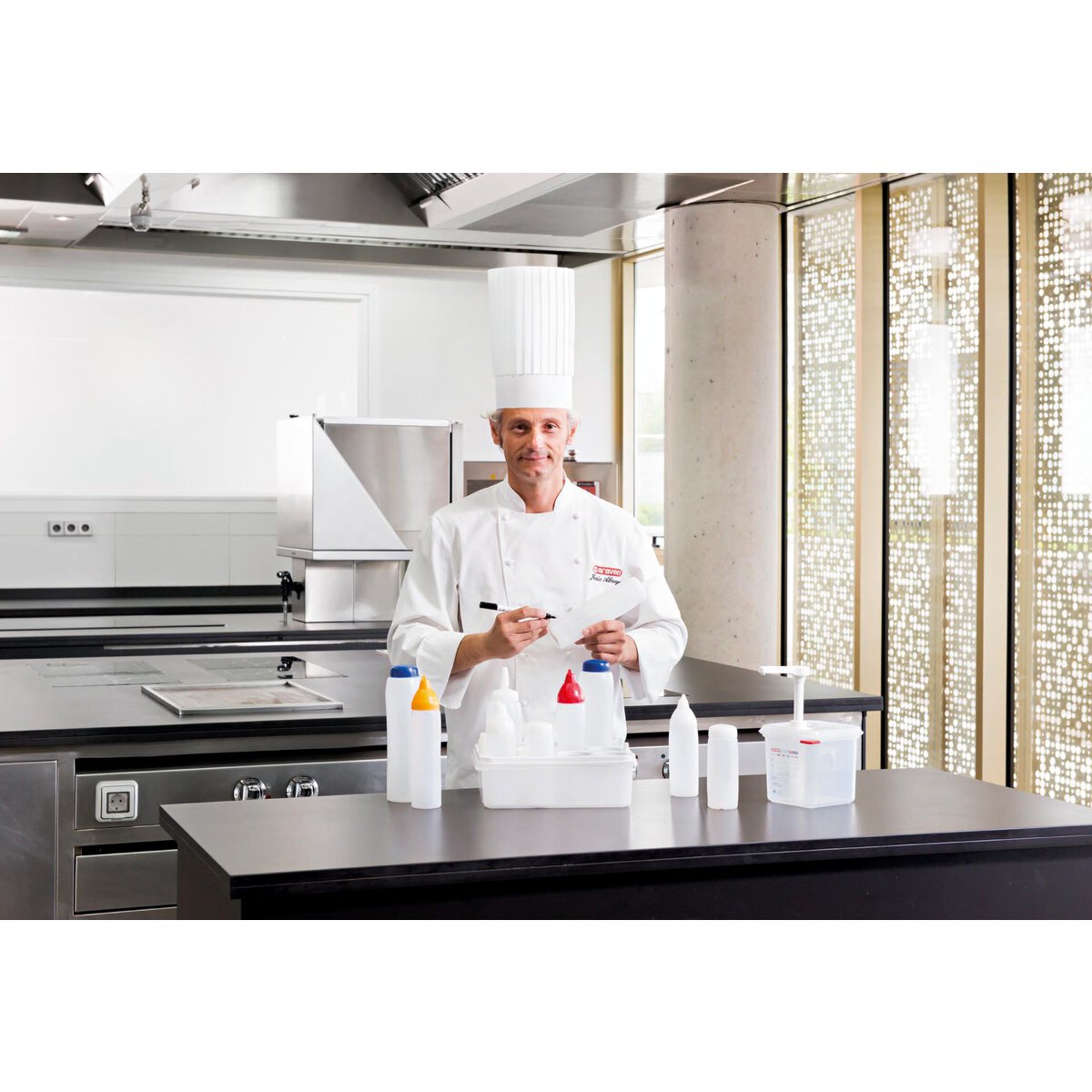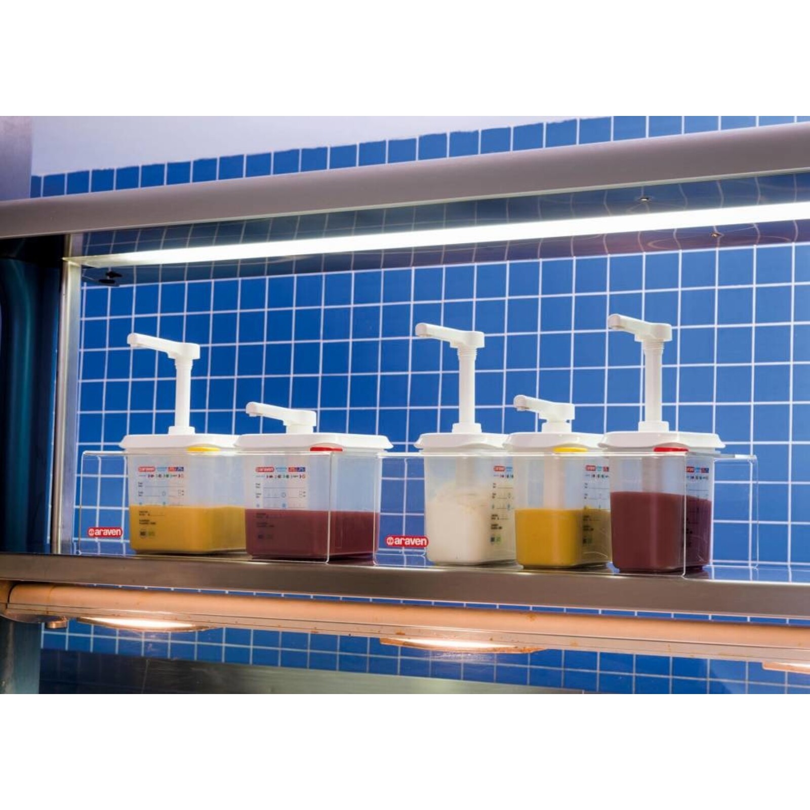 Polypropylen, transparent. Für Dressings, Soßen, Sirups, etc. Inkl. integrierter Skala, aufgedrucktes Etikett zum Beschriften mit Art.-Nr. 146700 (Stift schwarz), 4 farbliche Markierungsplättchen. Pumphahn ist platzsparend zu versenken.