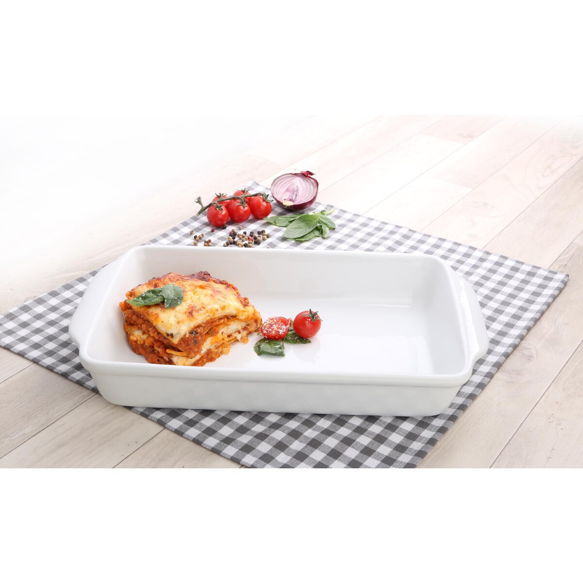 Porzellan, weiß, rechteckig. Robuste Ofen- und Auflaufform - feuerfest bis 350°C. Die stabilen Laffengriffe erlauben ein einfaches Entnehmen der heißen Auflaufform aus dem Ofen. Planer Boden. Spülmaschinengeeignet.