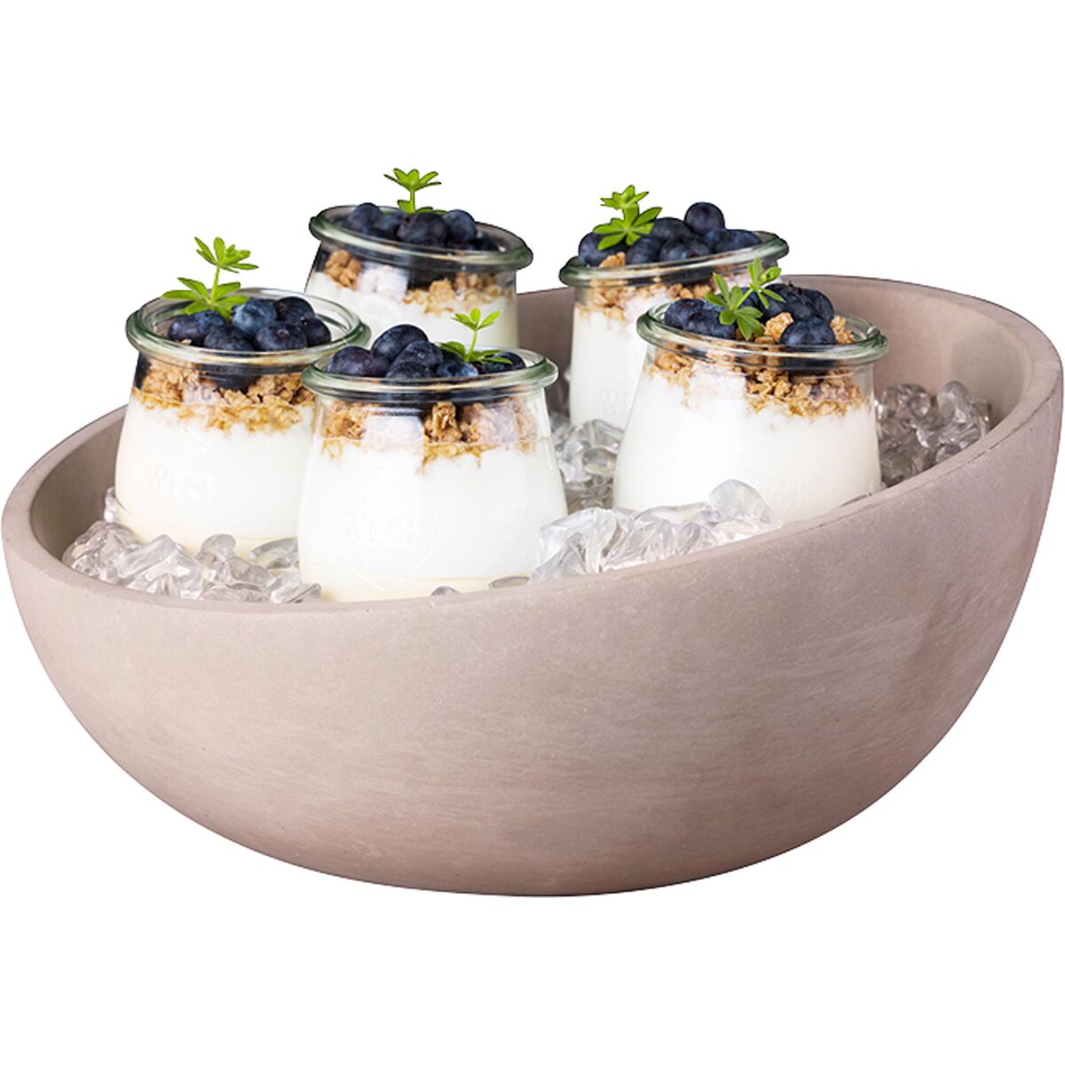 Schale aus Beton mit möbelschonender Filzunterseite. Höhe nach hinten ansteigend. Nicht für den Einsatz von Speiseöl und Essig geeignet. Stapelbar. Nicht spülmaschinengeeignet.