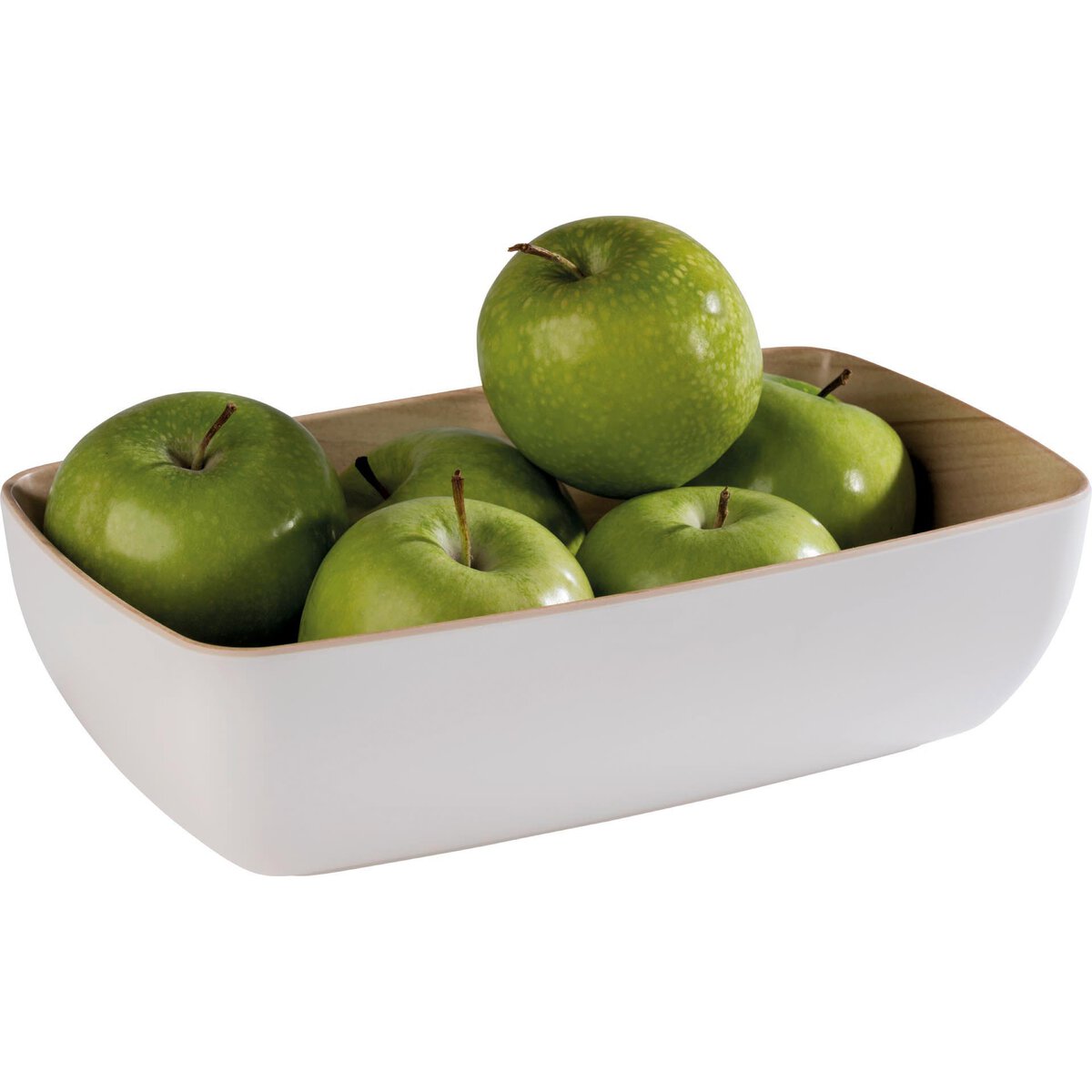 Melamin. Matte Oberflächen in Holzoptik innen und weiß außen. Stapelbar und spülmaschinengeeignet. Nicht geeignet für Backofen oder Mikrowelle und nicht direkter Hitze auszusetzen!