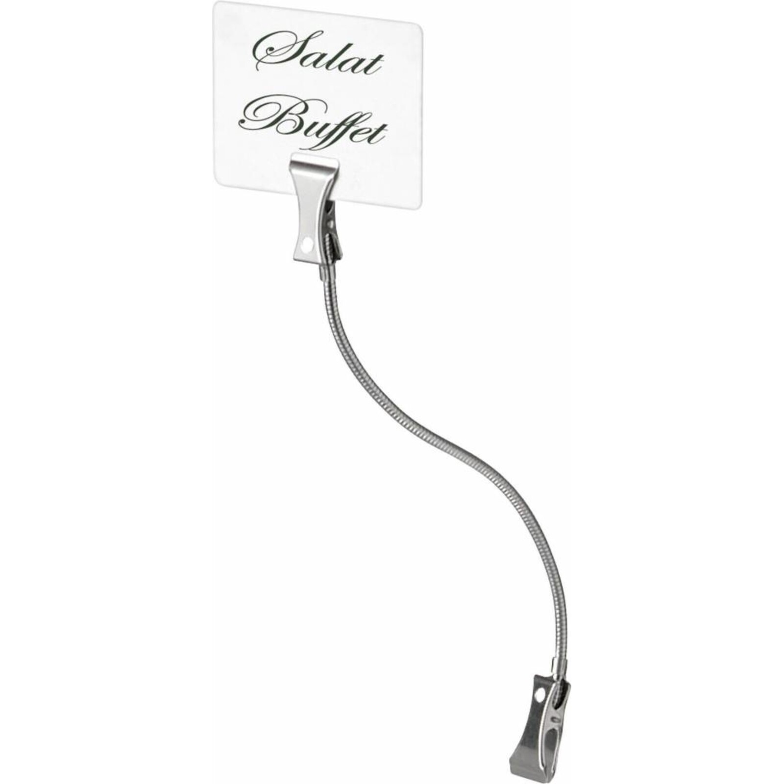Metall, biegsamer Draht. Mit zwei Klemmen. Extrem flexibel zum Anbringen an Schüsseln, Tabletts oder Körben. Klemmen lassen sich weit öffnen.