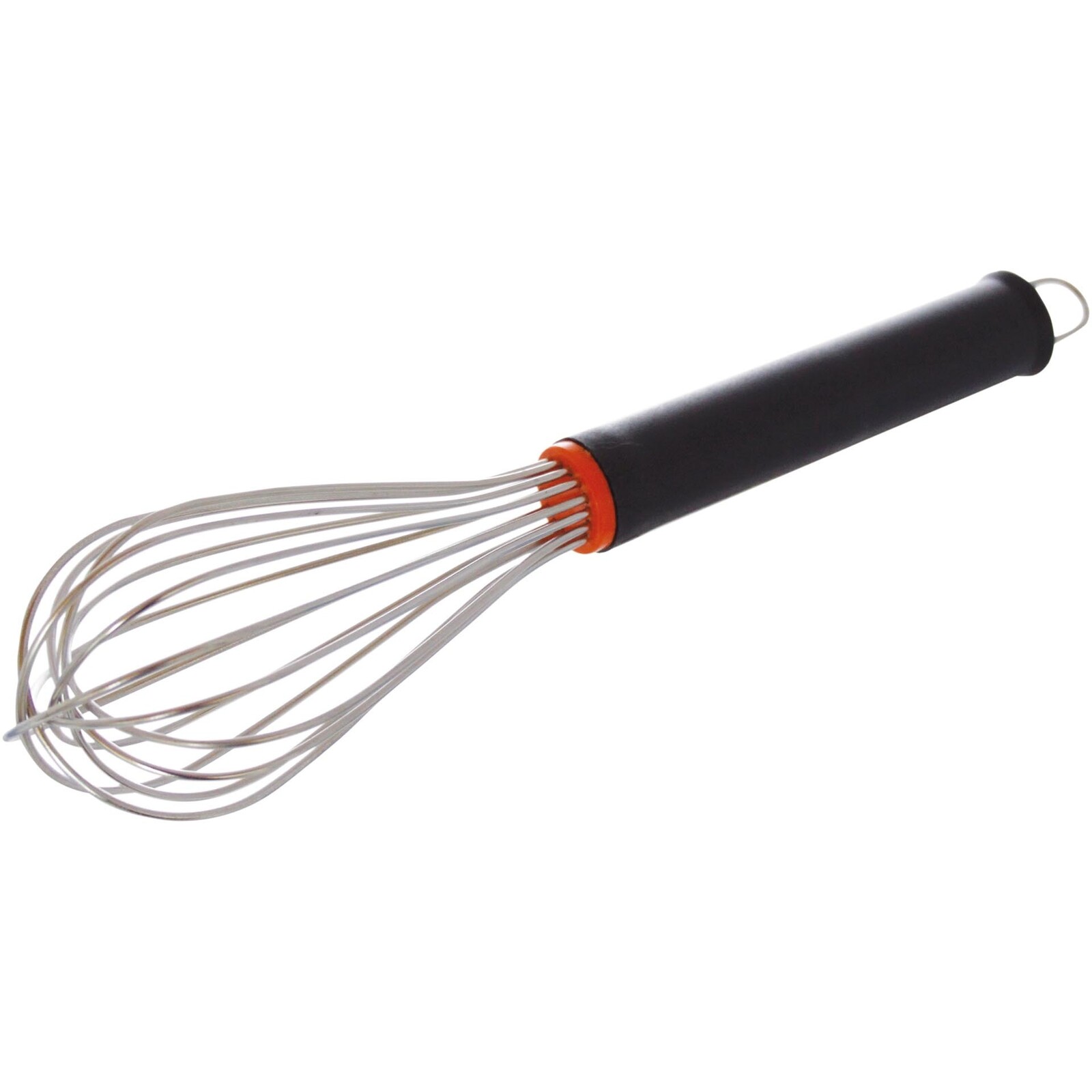 Schneebesen mit 24 Edelstahl-Drähten und schwarzem thermoplastischem Griff mit Aufhängeöse. Hitzebeständig bis 200°C. Spülmaschinengeeignet!
