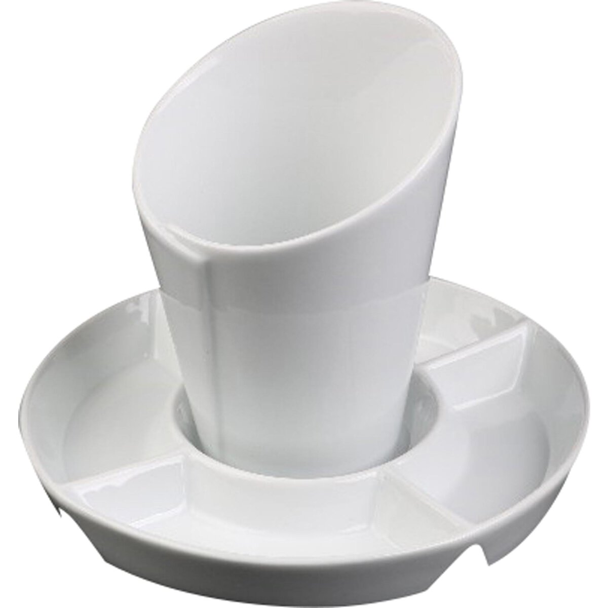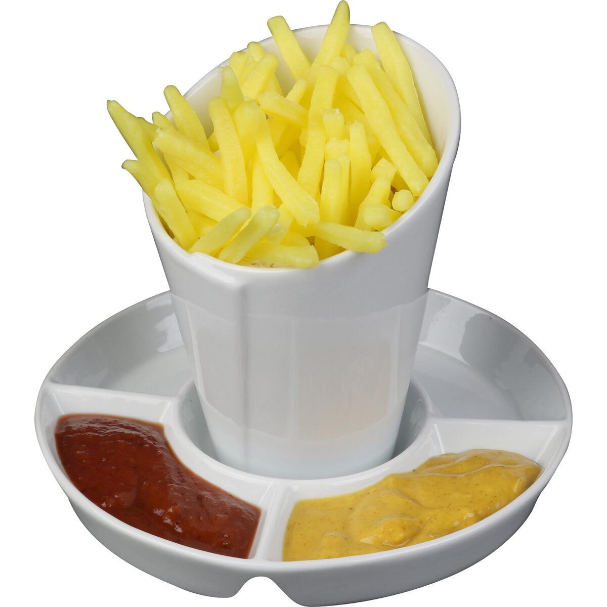 Porzellan, weiß. 4 Segmente à 0,05 L. Inhalt (strichvoll): 0,06 L. Passend zur Frittentüte 11301.