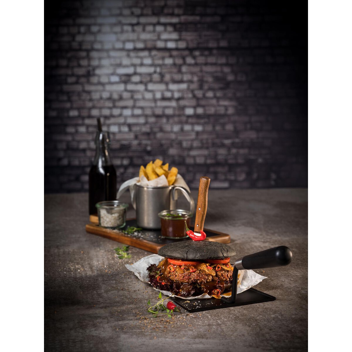 Schwarze Edelstahl Servierkelle mit schwarzem Holzgriff. Nicht als Tellerersatz oder Schneidunterlage, sondern ausschließlich zum Servieren geeignet. Oberfläche nicht kratzfest! Nicht spülmaschinengeeignet!