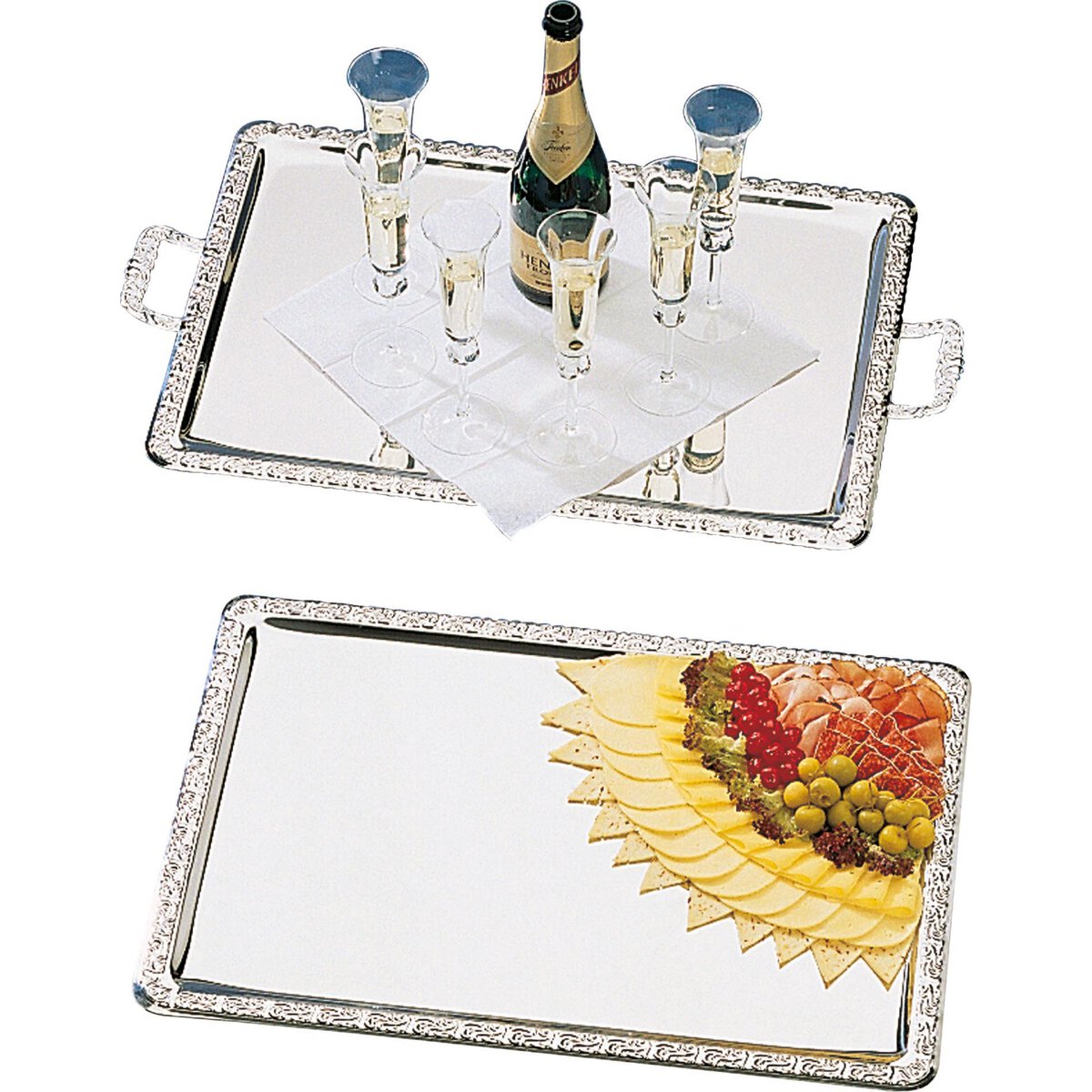 Edelstahl 18/0, poliert, mit Barockrand. Stärke 0,7 mm. Stapelbar. Spülmaschinengeeignet.
