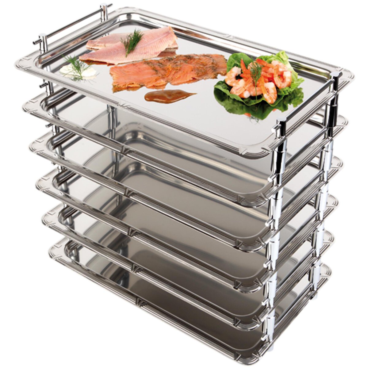1/1 GN, Edelstahl 18/10 mit Dekorrand und verchromten Griffen. Stärke: 0,8 mm, schwere Qualität. Stapelbar (Nutzhöhe 4cm). Spülmaschinengeeignet.