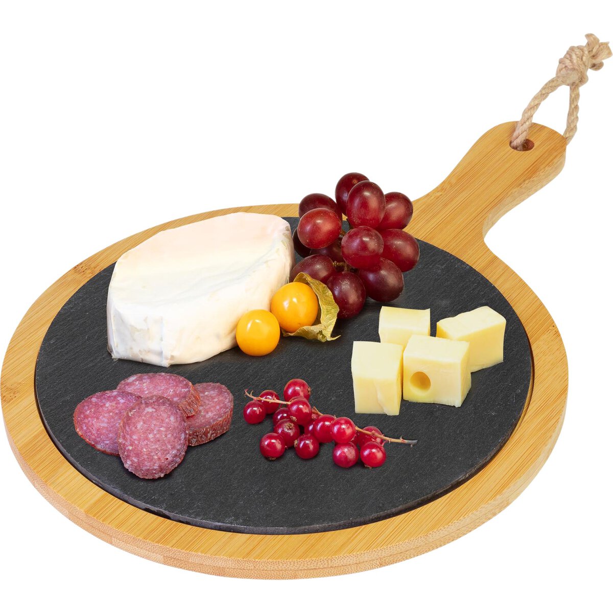 Servierplatte aus hochwertigem Naturschiefer und einer Einfassung aus Bambus. Ideal zum Servieren von Speisen. Die leicht zu reinigende Oberfläche ist fett- und wasserdicht, bedingt durch eine lebensmittelechte Spezialbeschichtung.