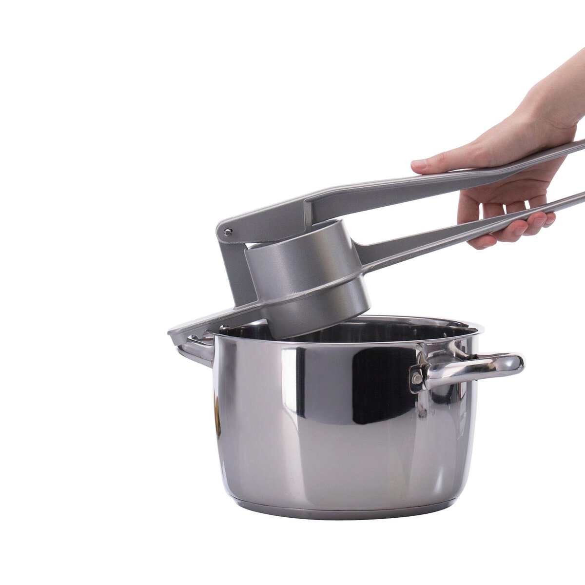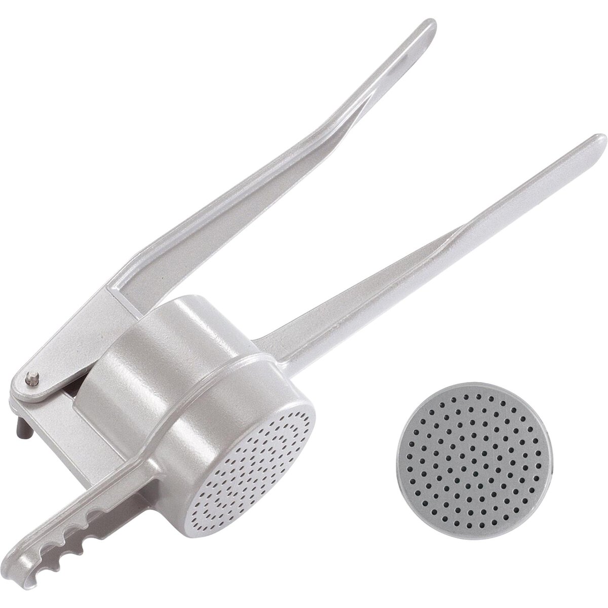 Aluminium beschichtet, ideal für die Zubereitung von Kartoffelpüree, Obstsäften, Spaghetti-Eis etc. der Griff ist unten abgeflacht und bietet mit den drei Auflagerasten vorne sicheren Halt auf verschieden großen Töpfen, spülmaschinengeeignet.