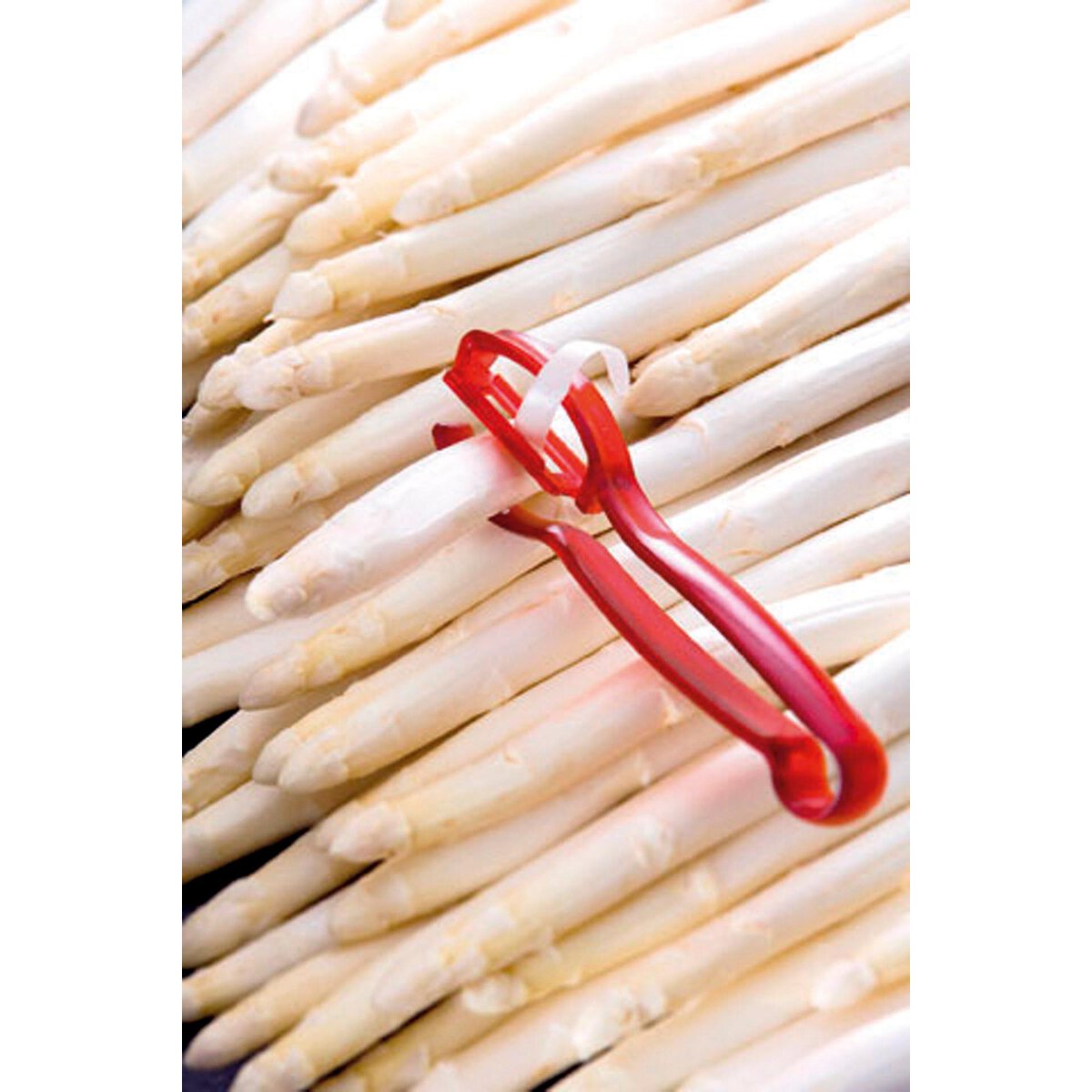 Griff aus formstabilem, elastischem Kunststoff. Klingenkopf umsteckbar für Links- und Rechtshänder. Klinge aus gehärtetem, rostfreiem Stahl. Aussparungen in der Klinge verhindern das Hängenbleiben der Fasern. Mit Schalenabweiser. Spülmaschinengeeignet.