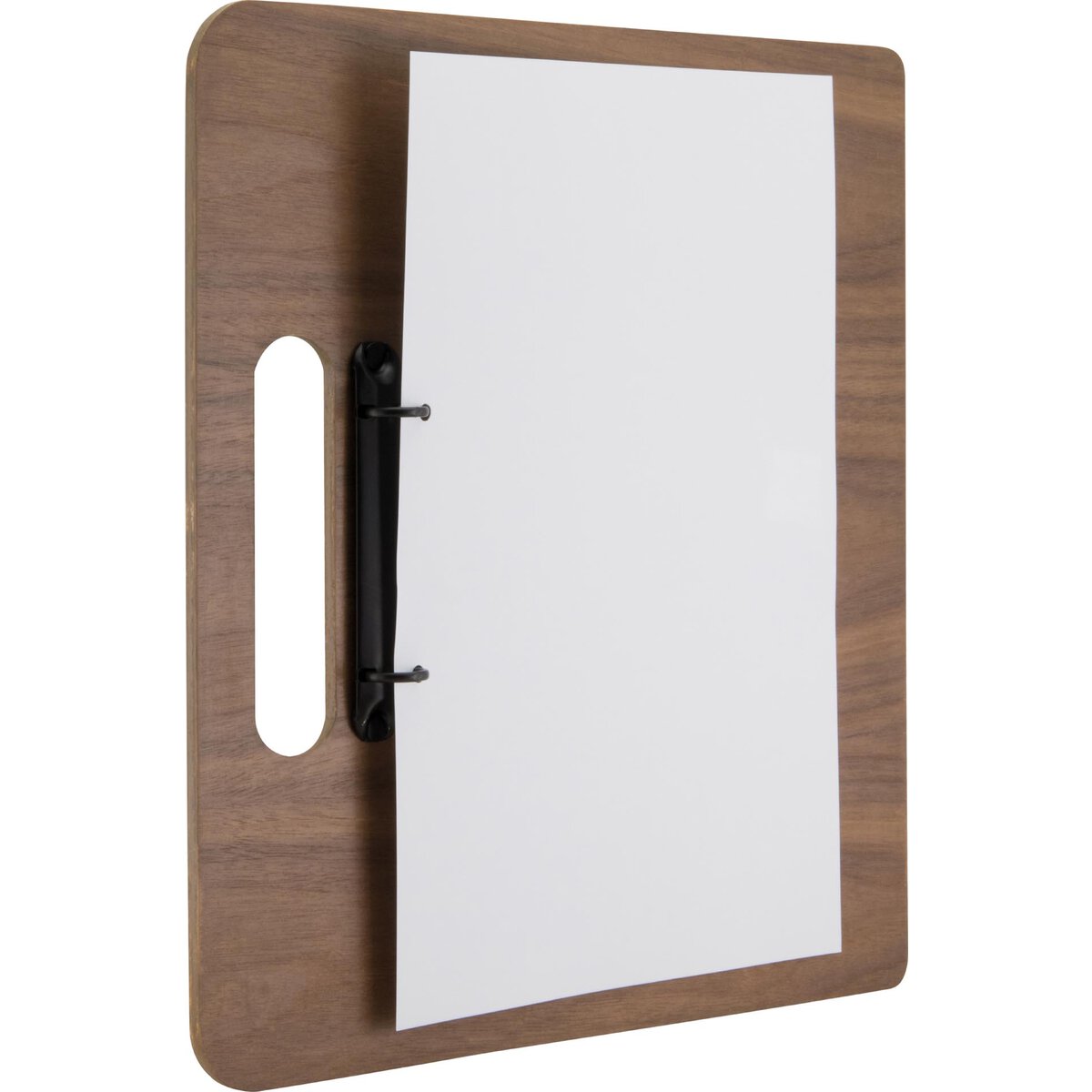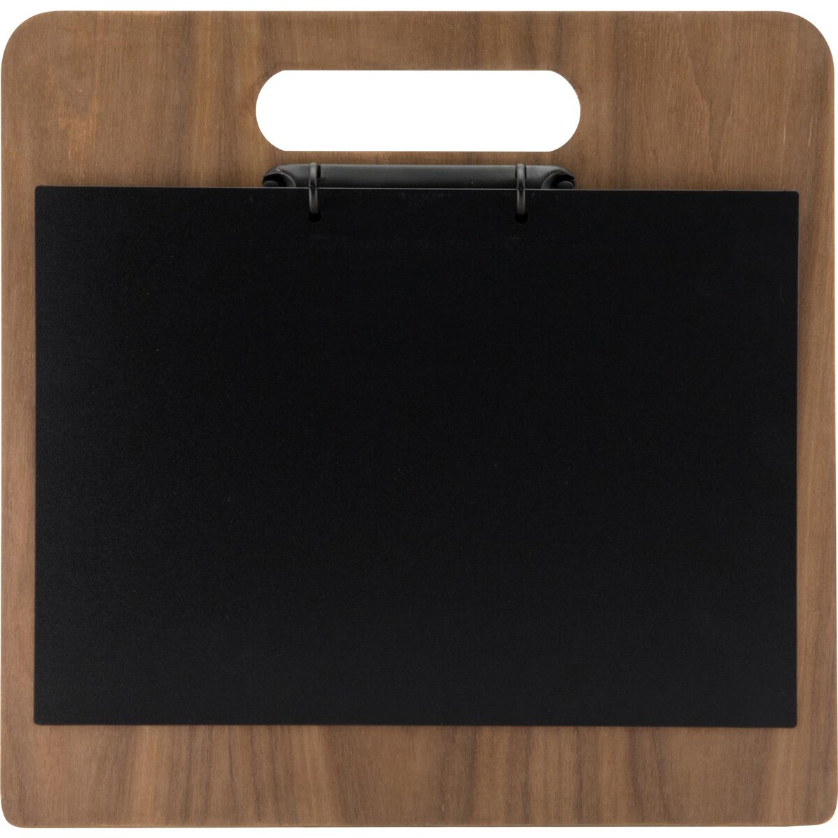 Walnußholz lackiert. Ringbuch (pulverbeschichtetes, schwarzes Metall). Abgerundete Ecken. Mit Griff. Inkl.1 Tafel - beschriftbar (einseitig) mit unseren Kreidemarkern.