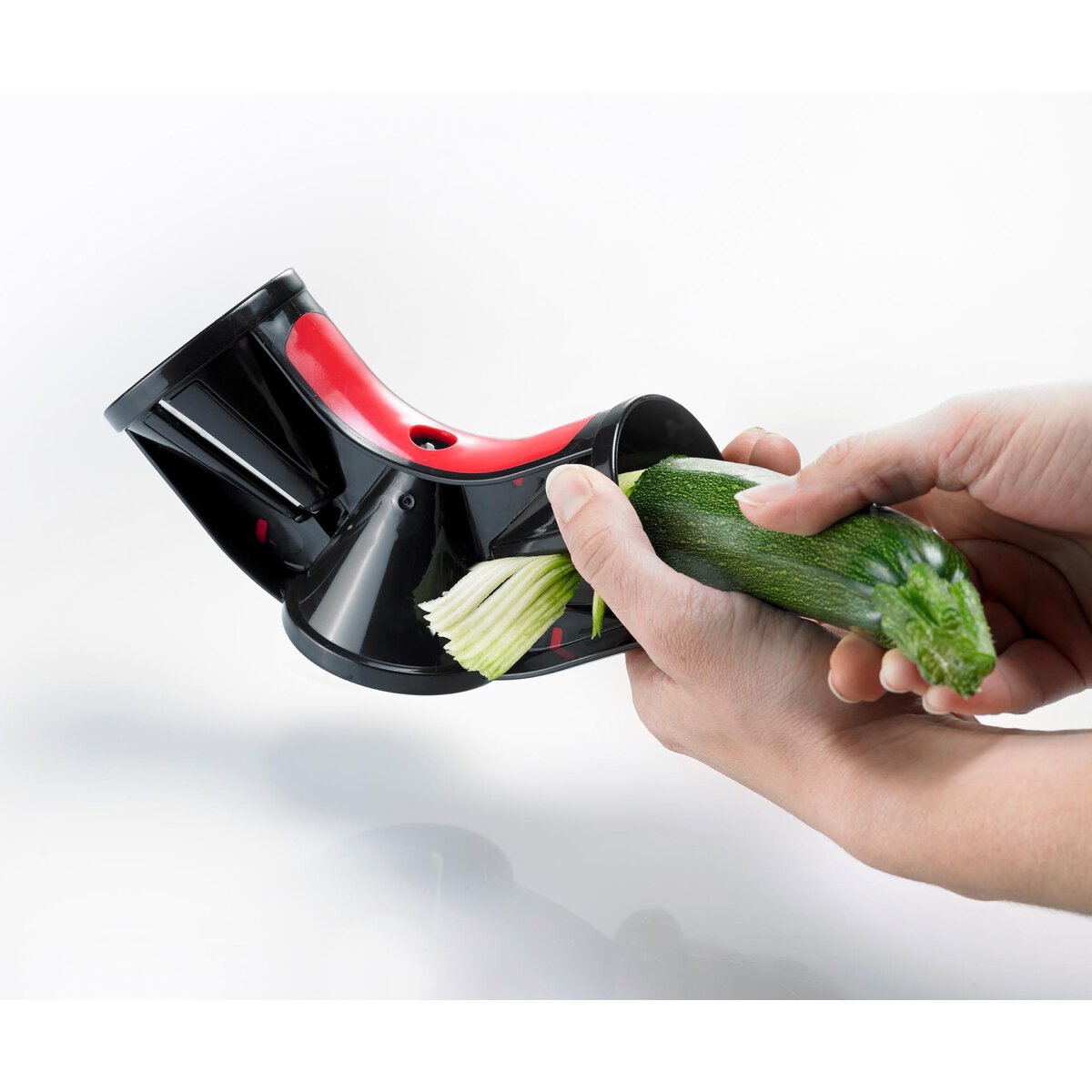 ABS, Edelstahl. Mit 3 Schneidkegeln. Schneidet Spiralen, Julienne fein & grob. Ideal zur Verarbeitung von Zucchini, Möhren, Gurken, Salat, länglichen Gemüsearten etc. Mit Restehalter. Spülmaschinengeeignet.