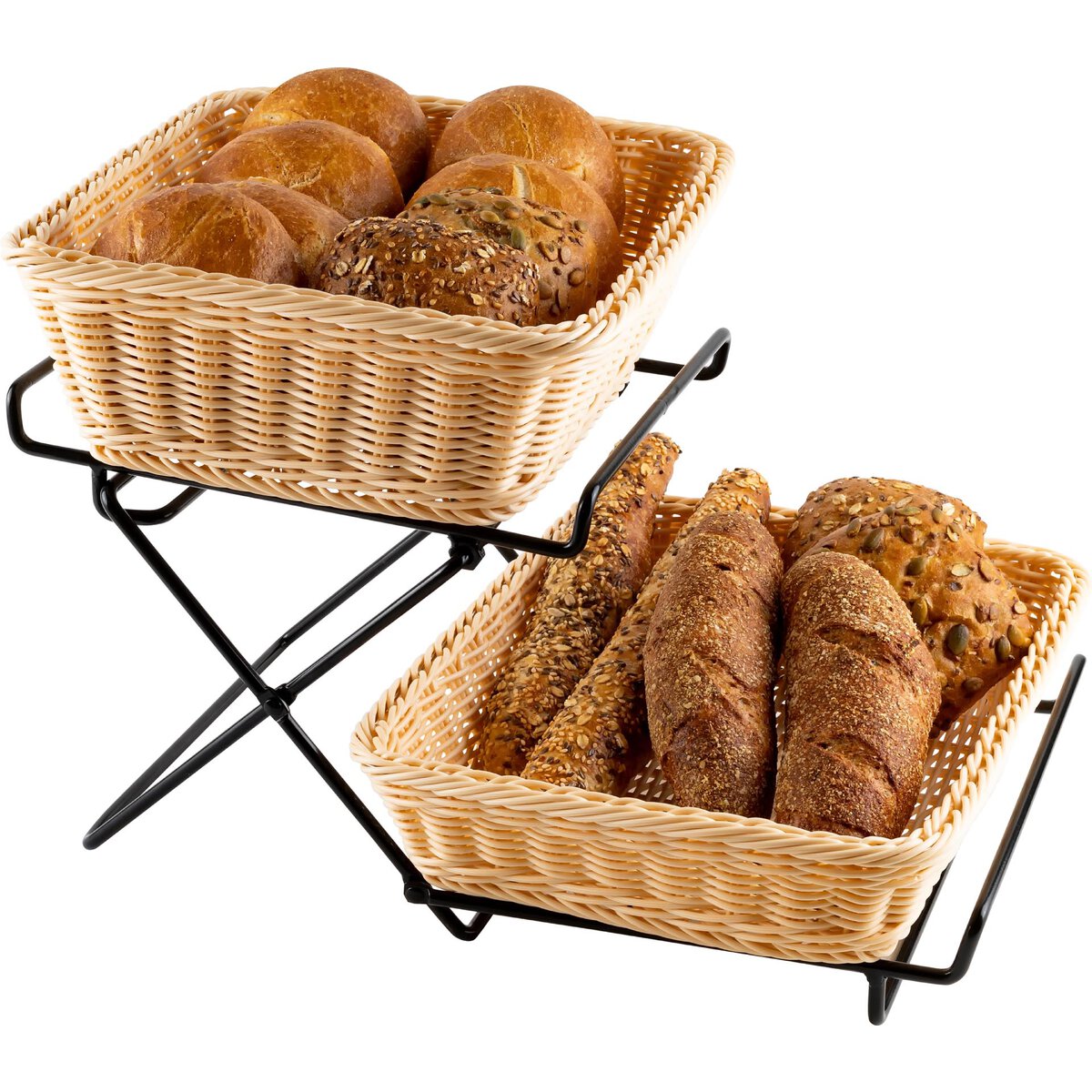 Schwarzes 2-stöckiges Gestell für 1/2-GN-Behälter. Zusammenklappbar. Lieferung ohne Körbe/ Behälter. Dazu passend Polypropylen-Körbe in 3 Farben und 2 Höhen - Bitte separat dazu bestellen!