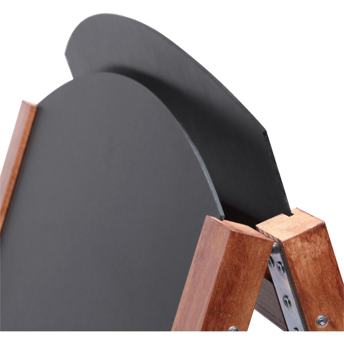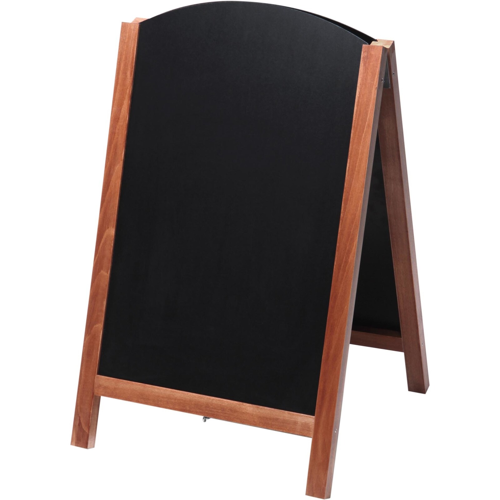 Gehwegtafel mit flachem Hartholzrahmen (MFC - melaminharzbeschichtete Spanplatte), gebeizt mit matter Schutzlackierung, auch für den geschützen Außenbereich geeignet (wetterfest mit UV beständiger Farbe), inkl. zwei Tafeln die jeweils doppelseitig beschreibbar sind, einfache Beschriftung durch Entnahme der Tafeln, feuerverzinkte Stahlscharniere, leichter Austausch der Tafeln (hochdrucklaminiert, HPL) durch die offene Oberseite. Sichtbare Abmessungen: BxH in cm: 47,0x66,0. Außenmaße: BxHxT in cm: 55,0x86,2x58,6. Schreiboberfläche: BxH in cm: 47,0x75,0.