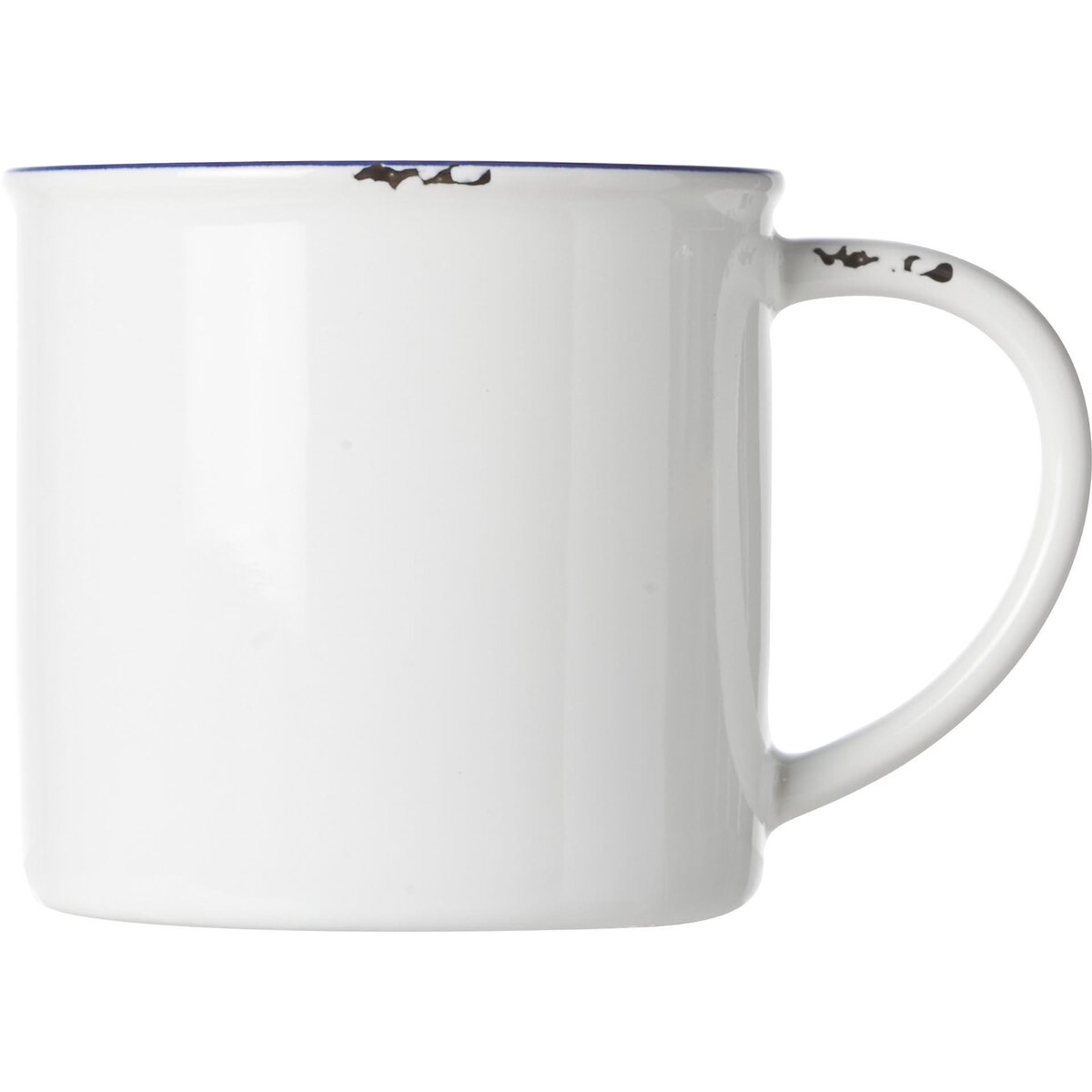 Steinzeug im Vintage-Look, weiß mit blauem Rand und optisch abgeschlagenen Ecken und Kanten in schwarz. Spülmaschinengeeignet.