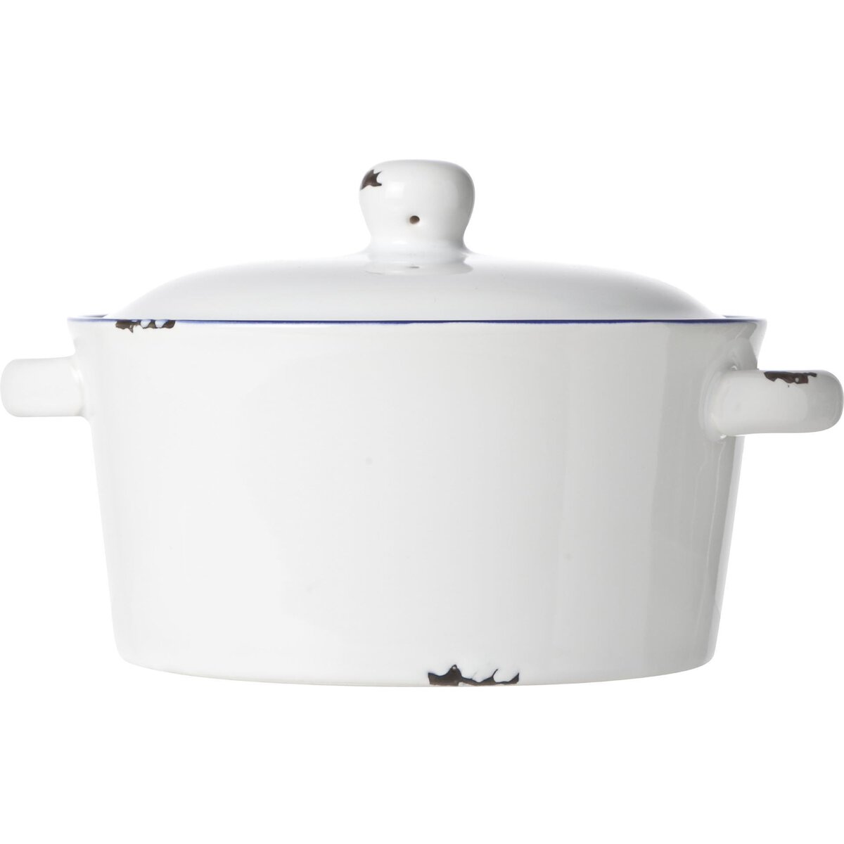 Steinzeug im Vintage-Look, weiß mit blauem Rand und optisch abgeschlagenen Ecken und Kanten in schwarz. Spülmaschinengeeignet.