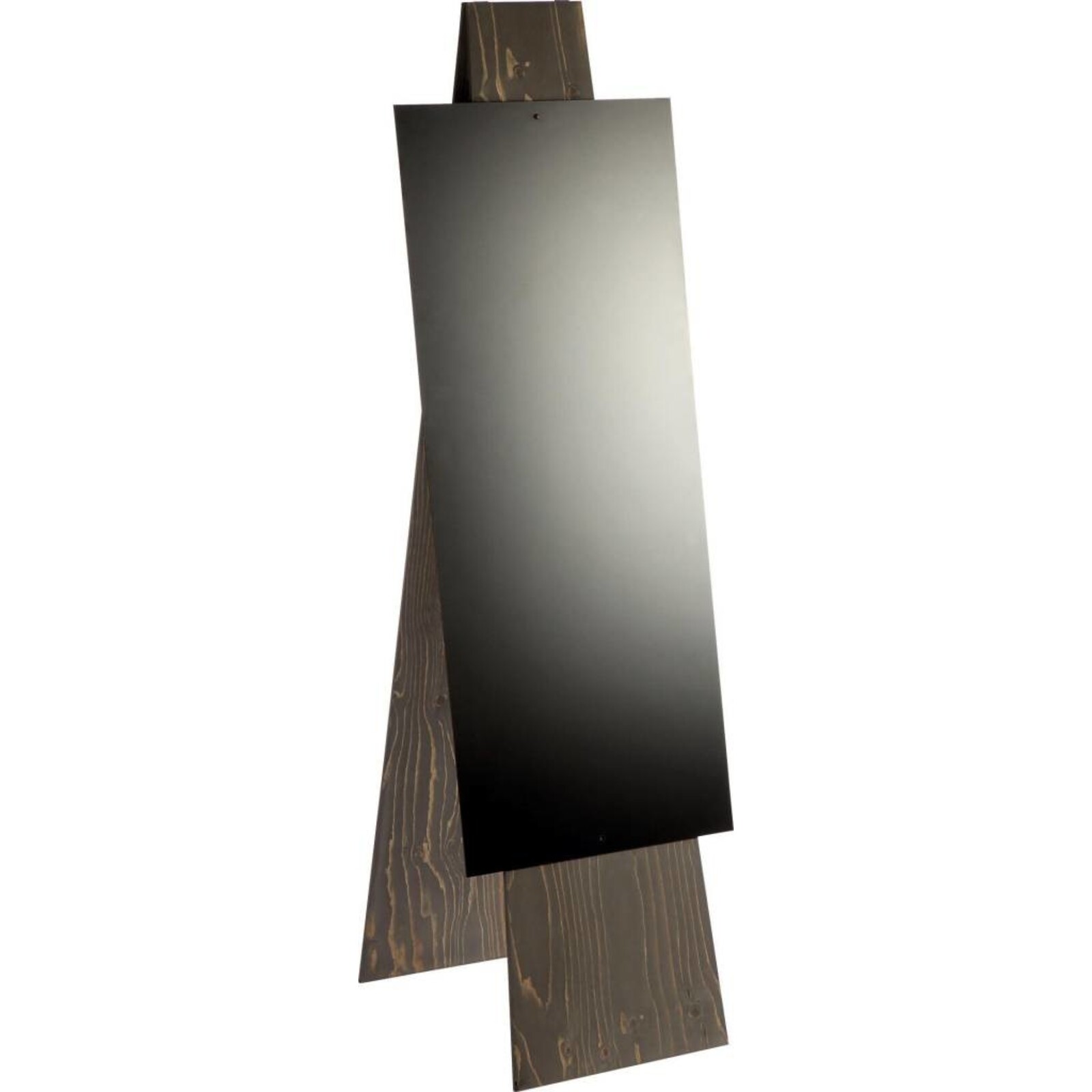 Doppelseitige Standtafel. Sperrholz, grau geölt. Inklusive zwei schwarzen Schieferlacktafeln, 50x120 cm. Verstärkte Leisten. Seitliche Arretierung.