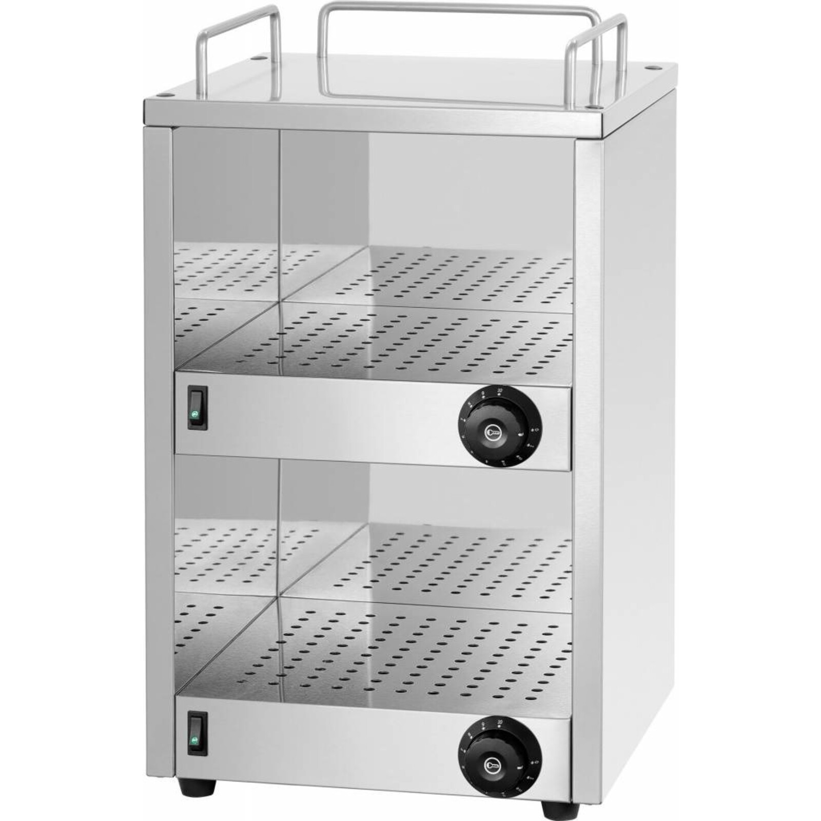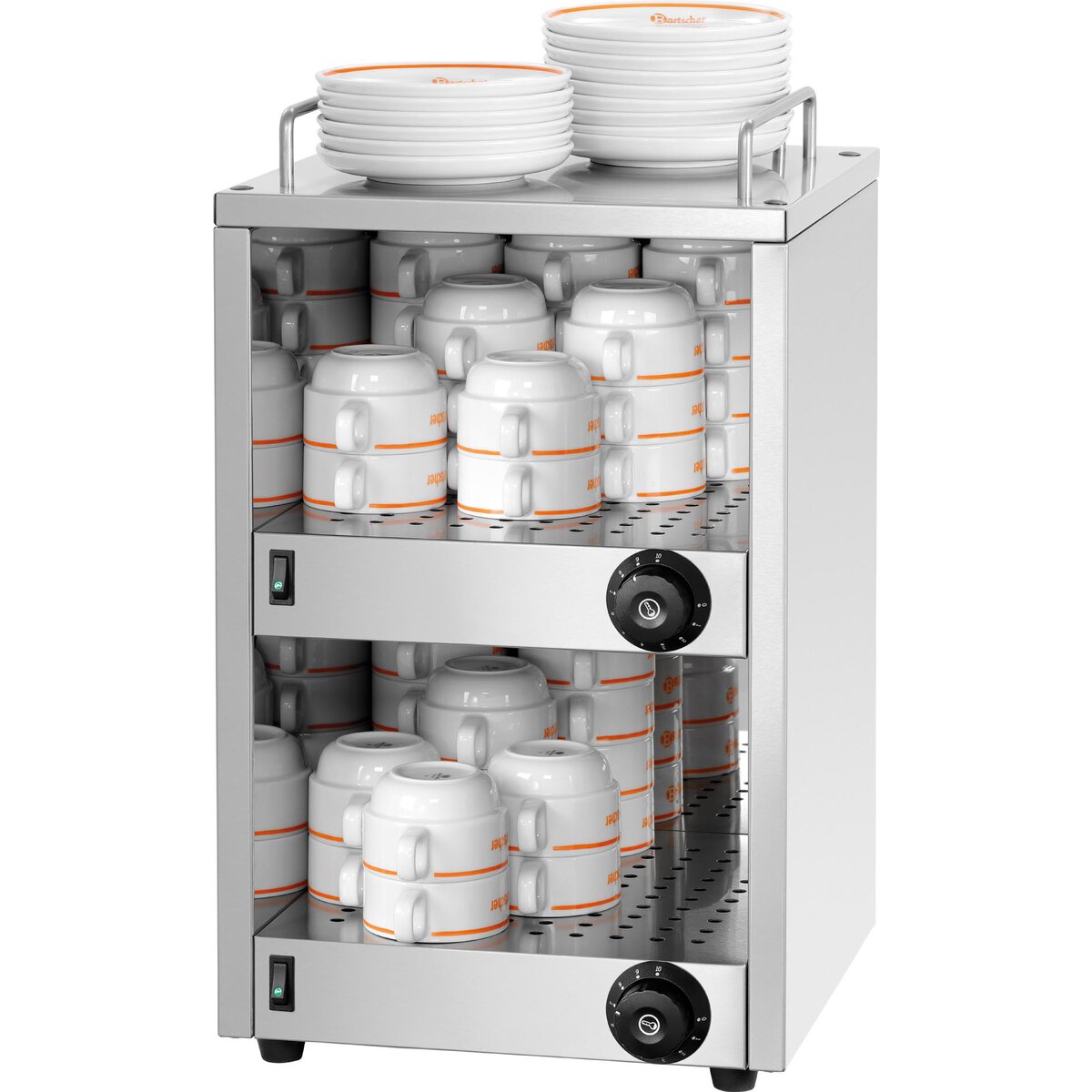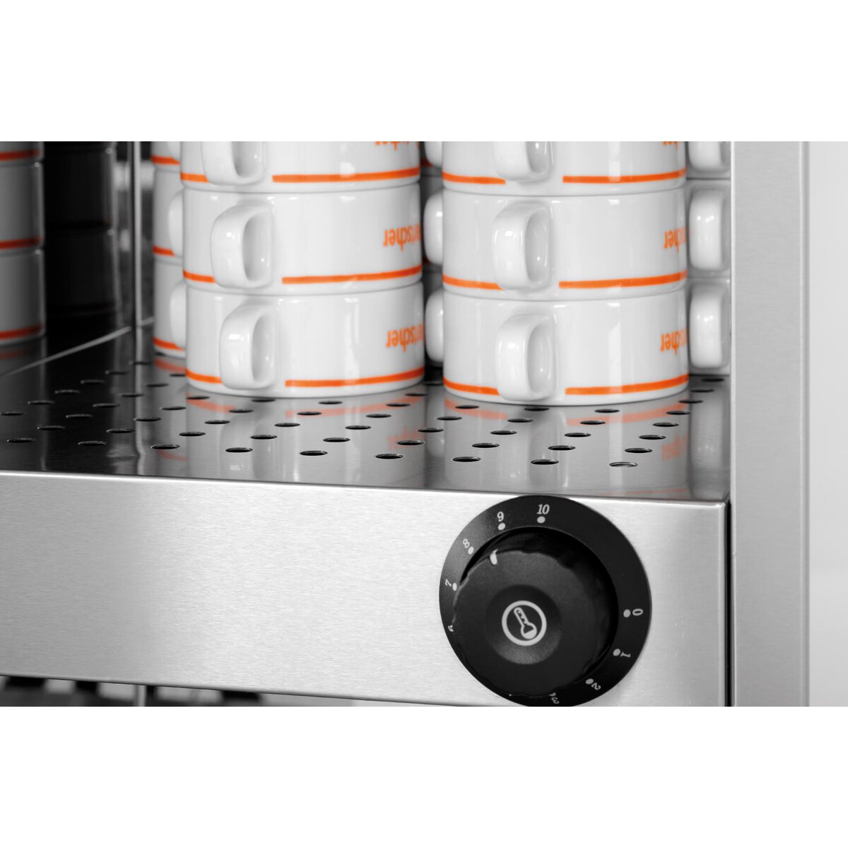 Edelstahl, für bis zu 72 Tassen, Tassentemperatur ca. 60°C. Die getrennt schaltbare Wärmezufuhr lässt sich für beide Ebenen stufenlos regulieren. Ablagefläche BxT in cm: 25x25, zum Abstellen von Untertellern, Tassen etc. Gewicht: 10,3 kg.