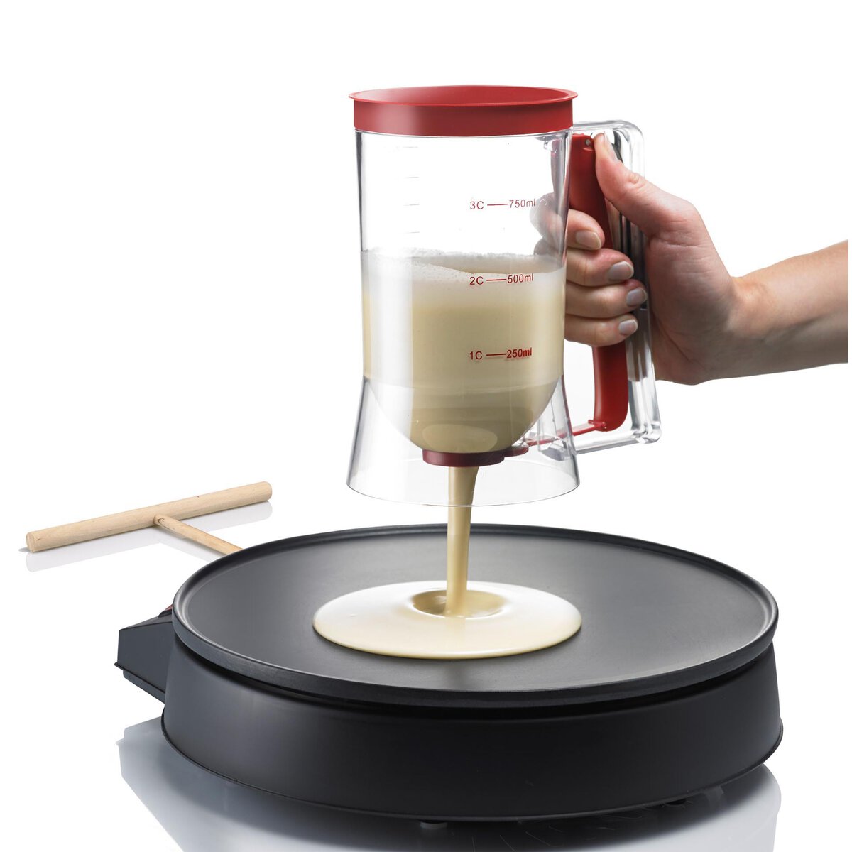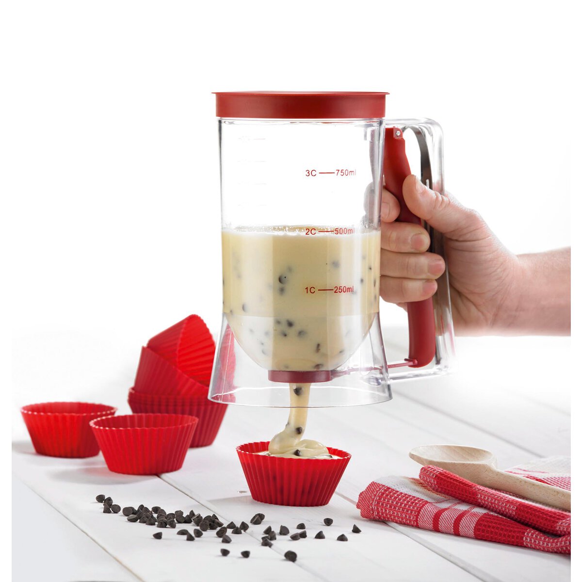 Polystyrol. Einhandbedienung durch Druckfunktion im Griff. Ideal zum Dosieren von Rührteig z.B. für Muffins, CakePops, Donuts, Pfannkuchen & Co. Pflegehinweis: Per Hand mit mildem Spülwasser reinigen, klar ausspülen und trocknen lassen.