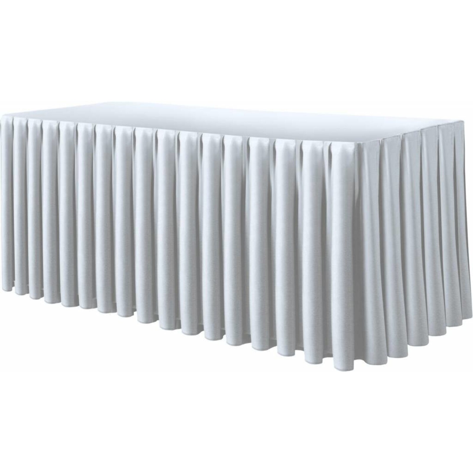 Komplett in einem Stück: Tischdecke und Skirting sind aneinander genäht, für einen schnell gedeckten Tisch ohne lästige Montage-Clips. 100% Polyester, in den Farben weiß und bordeaux.