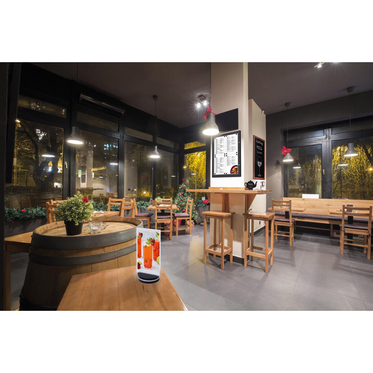 Kunststoff PS transparent mit schwarzem Fuß. Langlebig, spritzgegossene klare Styrollösungen, einfacher Kartenwechsel. Sichtbare Abmessungen: BxH in cm: 10,0x20,0. Außenmaße: BxHxT in cm: 10,9x22,5x9,1. Für Papiergröße: 10,2x19,8 cm.