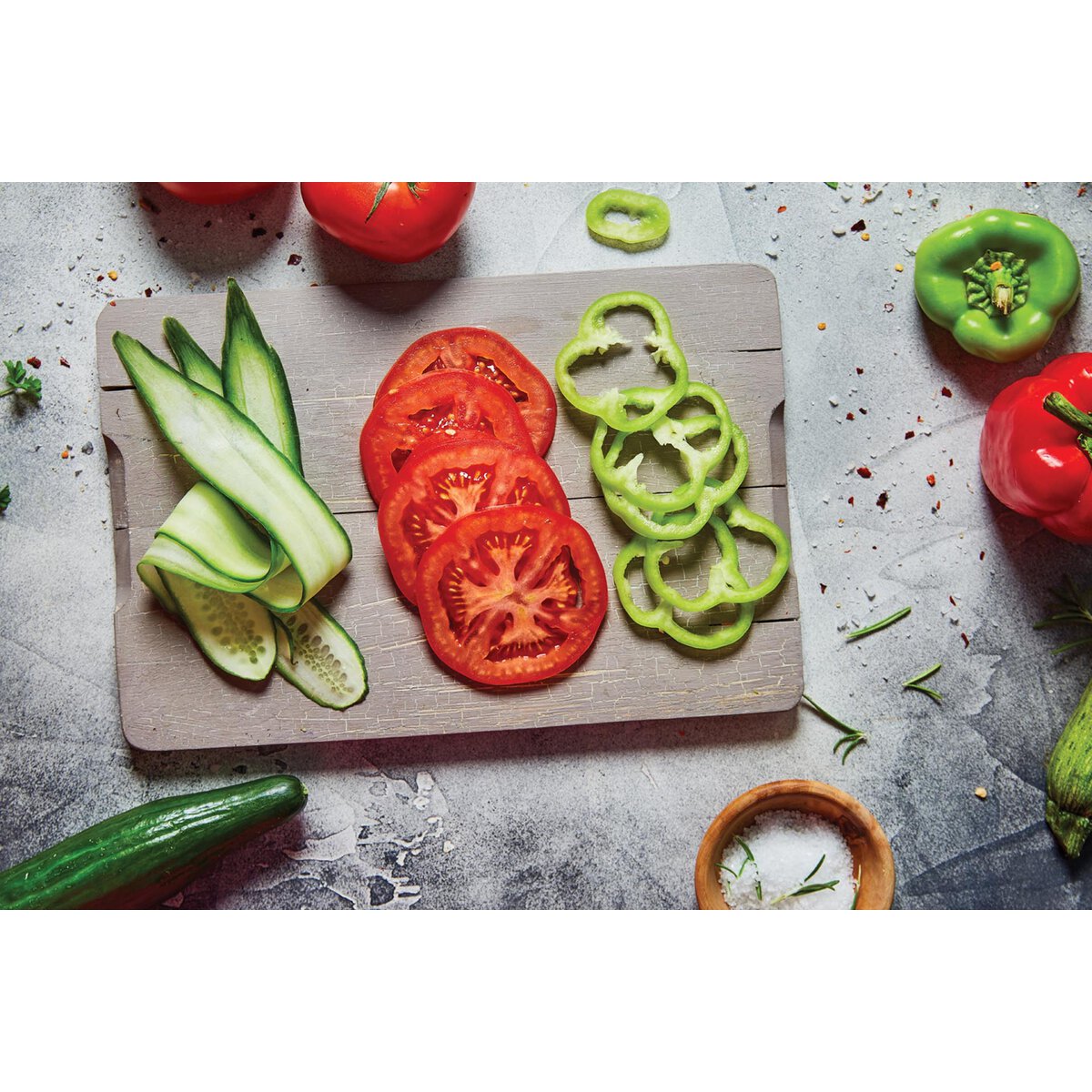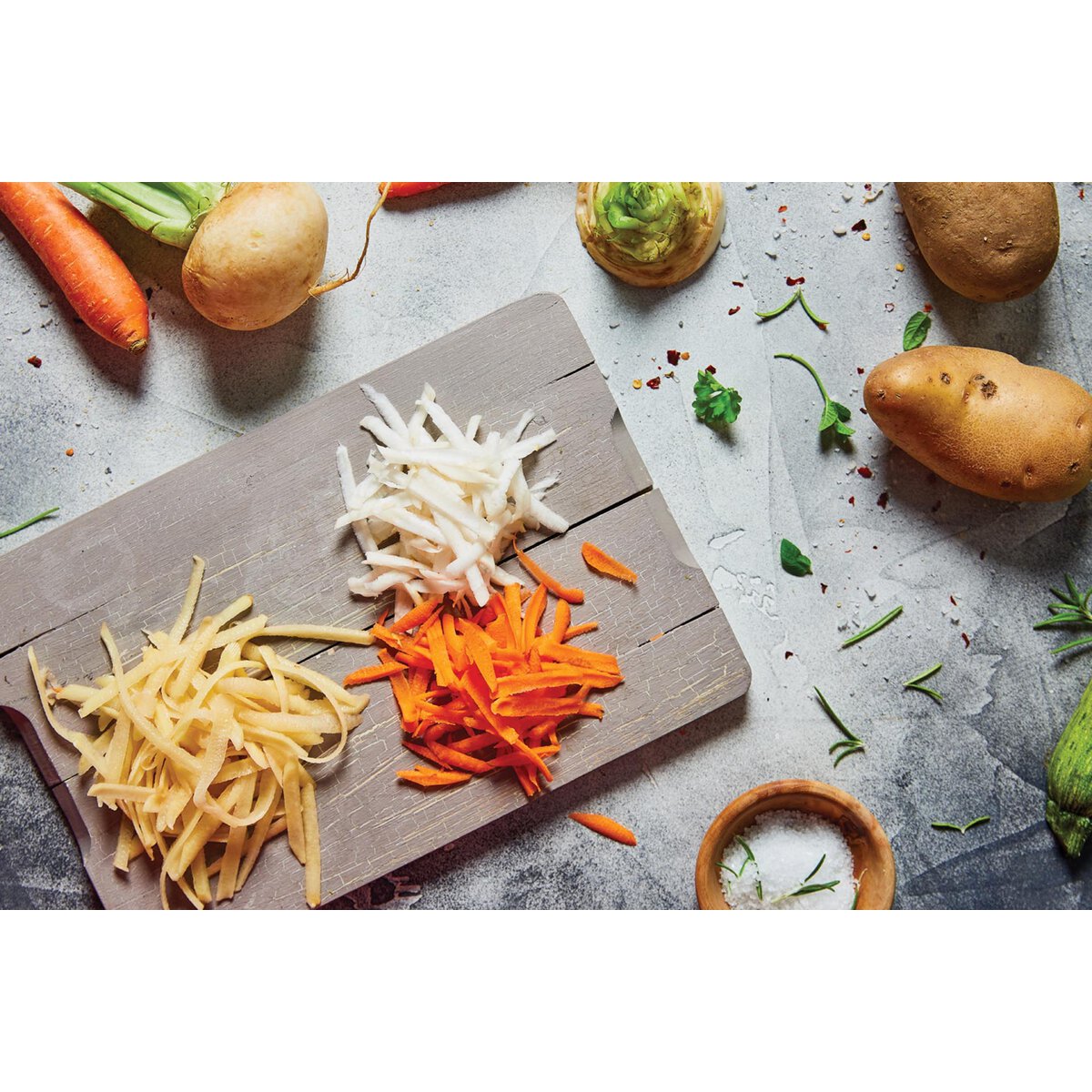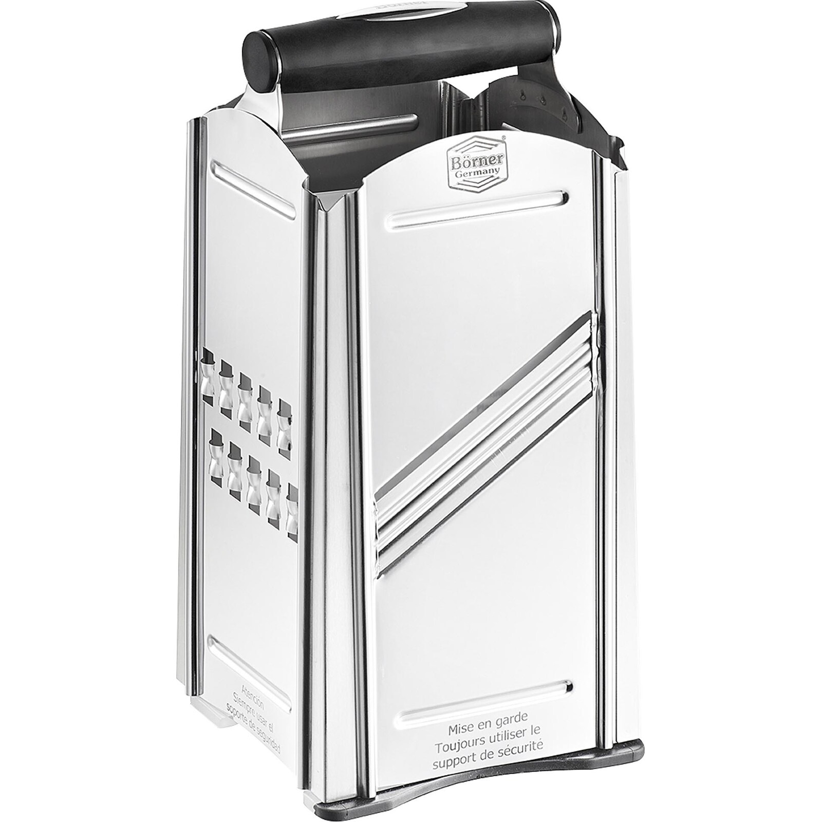 Vierkantreibe aus Edelstahl. Durch den Scheibenschneider, Julienne-/Rohkostschneider, die Reibe und Rösti-Reibe, sind vier Funktionen in einem Produkt vereint. Lieferumfang: Edelstahlreibe, innenliegende Auffangschale aus Kunststoff und Fruchthalter. BxHxT: 13x26x13cm.