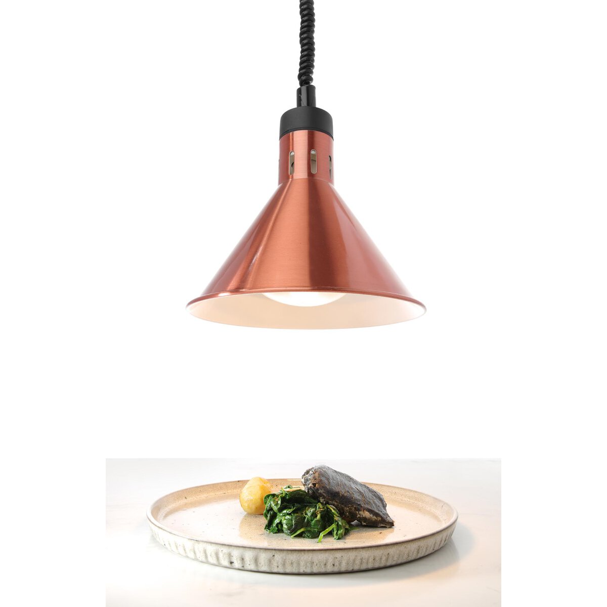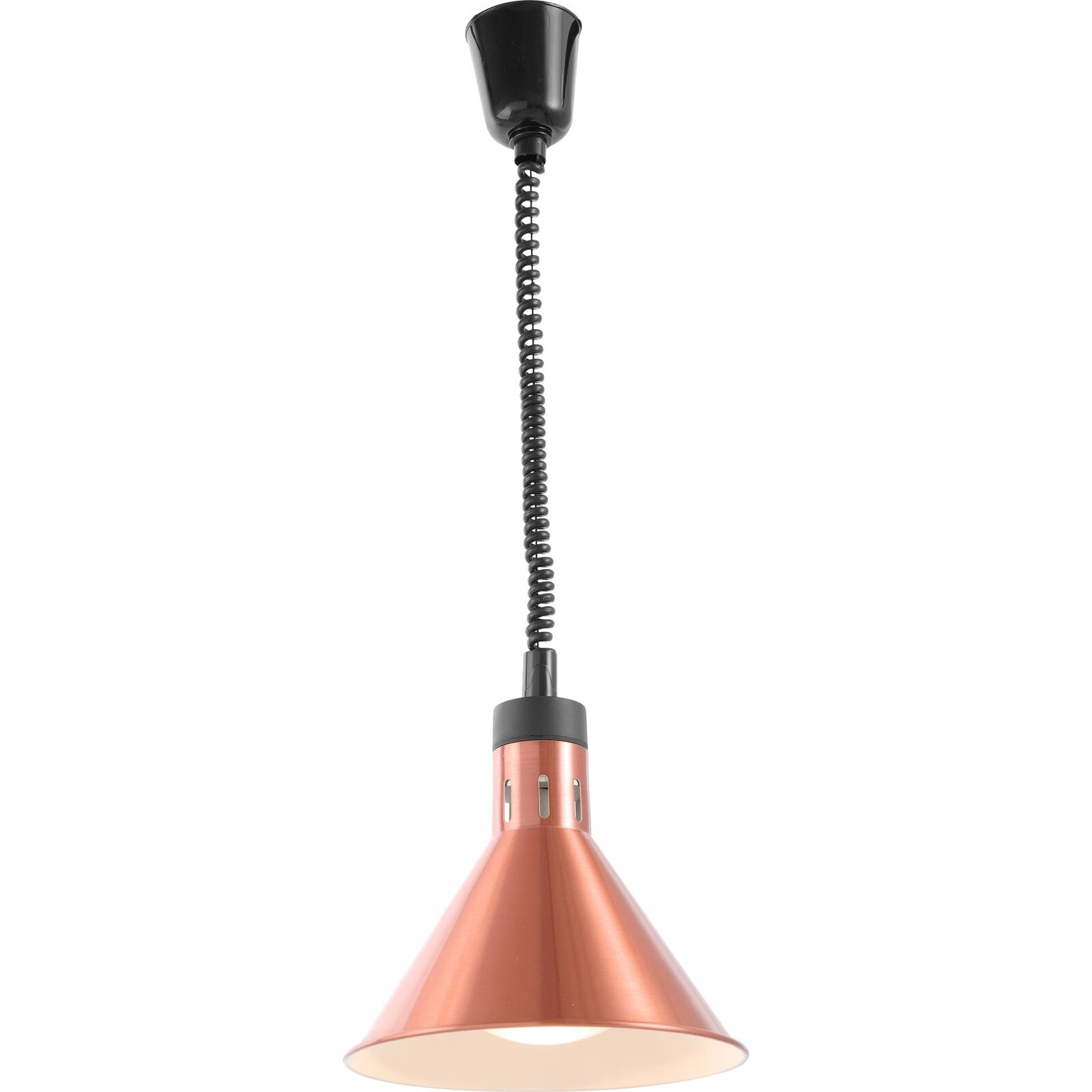Aluminium. Sehr flexibel und individuell einsetzbar dank der regulierbaren Schnurlänge von 70 bis 150 cm. Die Wärmeleistung kann durch die Höheneinstellung der Lampe für jeden Bedarf reguliert werden. Der Ein-/ Ausschalter befindet sich auf der Oberseite der Lampe. Dank der bruchsicheren Glühbirne (inkl. 1x weiß) bestens geeignet zum Warmhalten von Speisen aller Art. 230V/ 250W. ØxH in cm: 27,5x25,0.