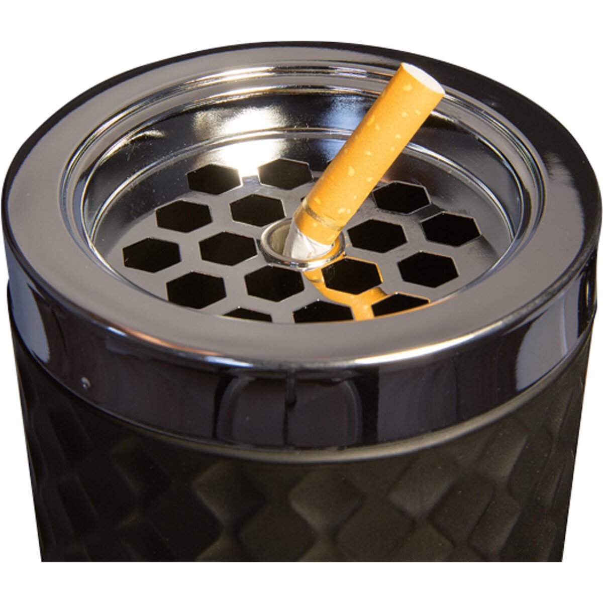Metall verchromt, Glas gefrostet, mit Bajonettverschluss, sicheres Ausdrücken der Glut, stapelbar. Farbe: schwarz