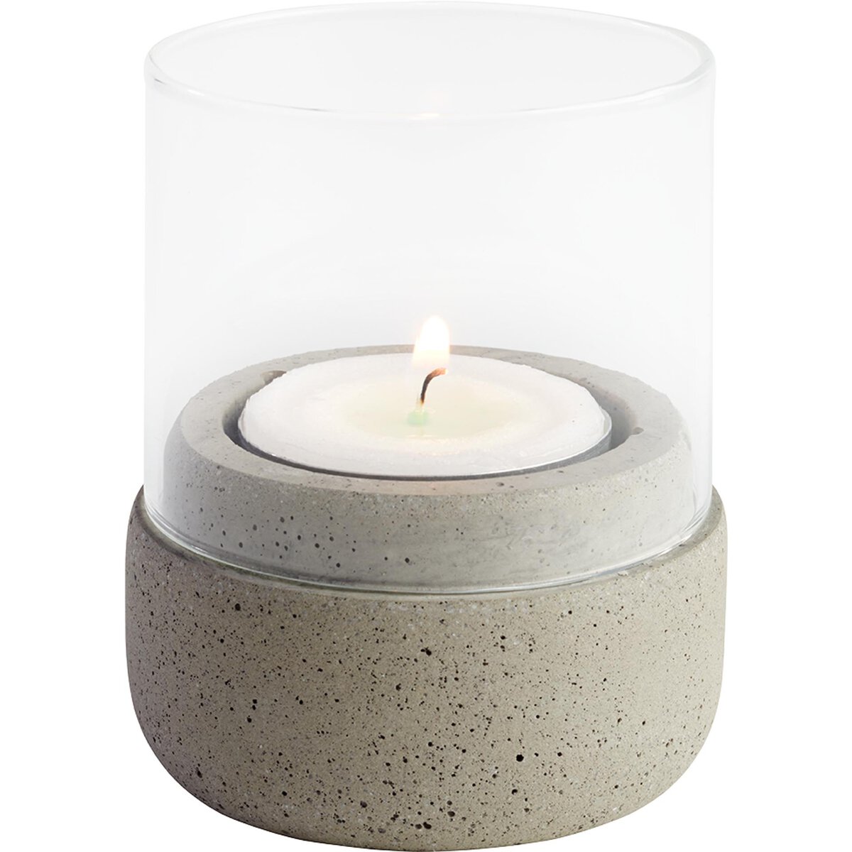 Fassung aus Beton mit möbelschonender Filzunterseite. Klares Windlicht-Glas. Mit Teelichtern bestückbar. Nicht spülmaschinengeeignet.